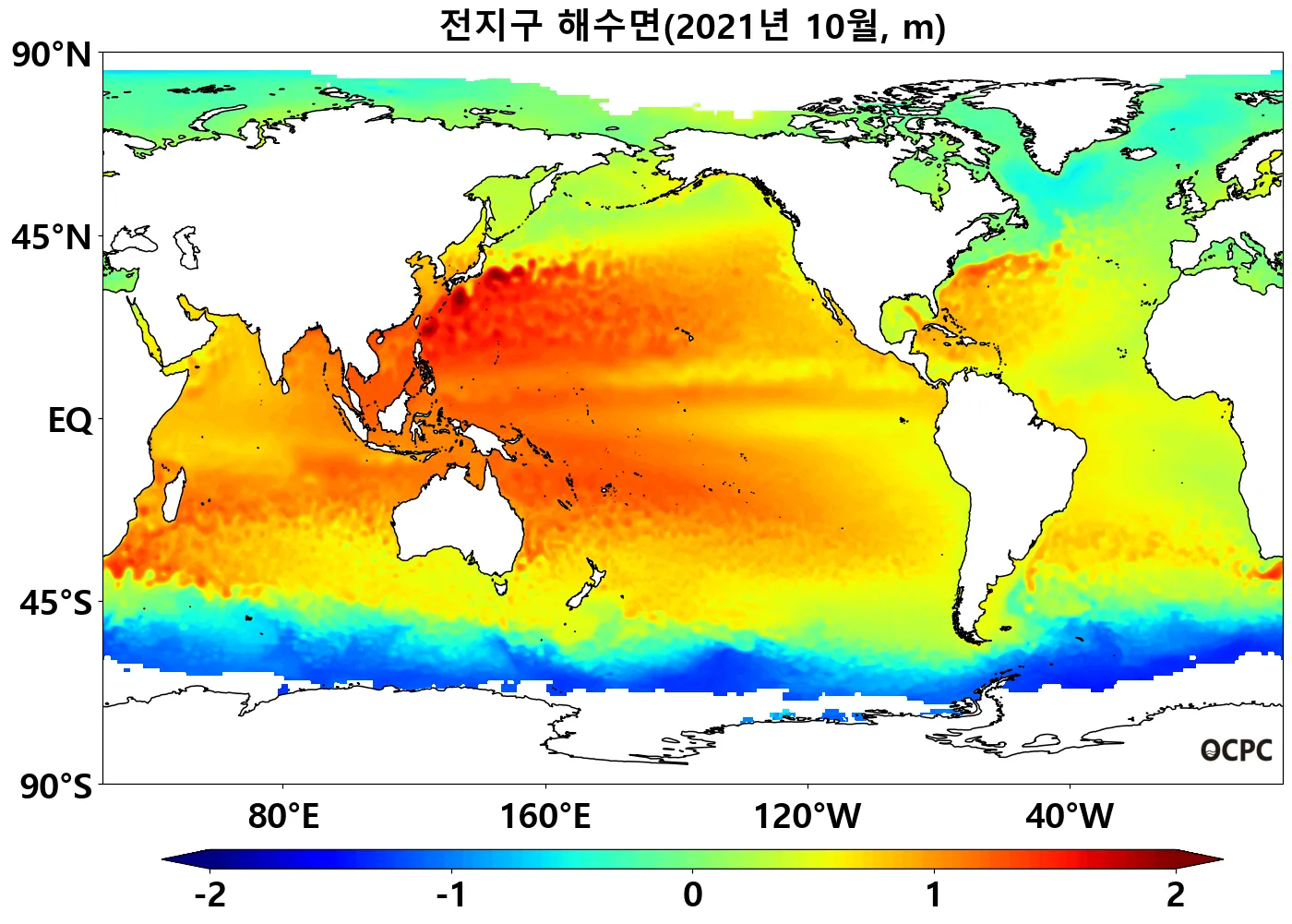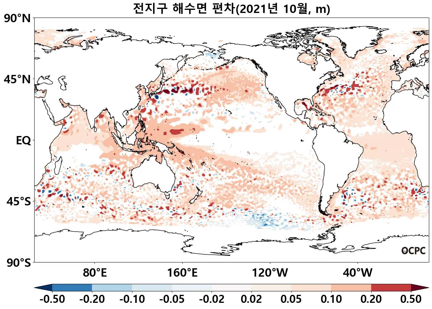 전지구 평균 해수면은 평년보다 5.7cm 높았고, 열대 서태평양 해역의 상승이 두드러졌습니다.