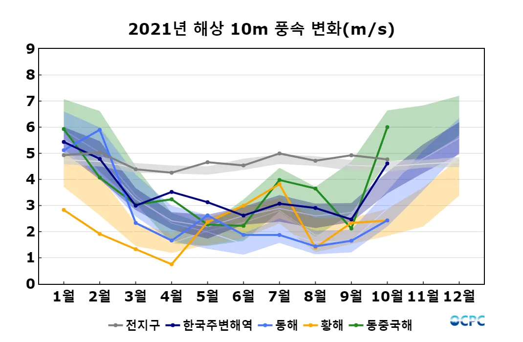 동해, 황해, 동중국해의 해상풍속은 평년(2.9m/s, 2.4m/s, 5.7m/s)과 비슷했습니다.