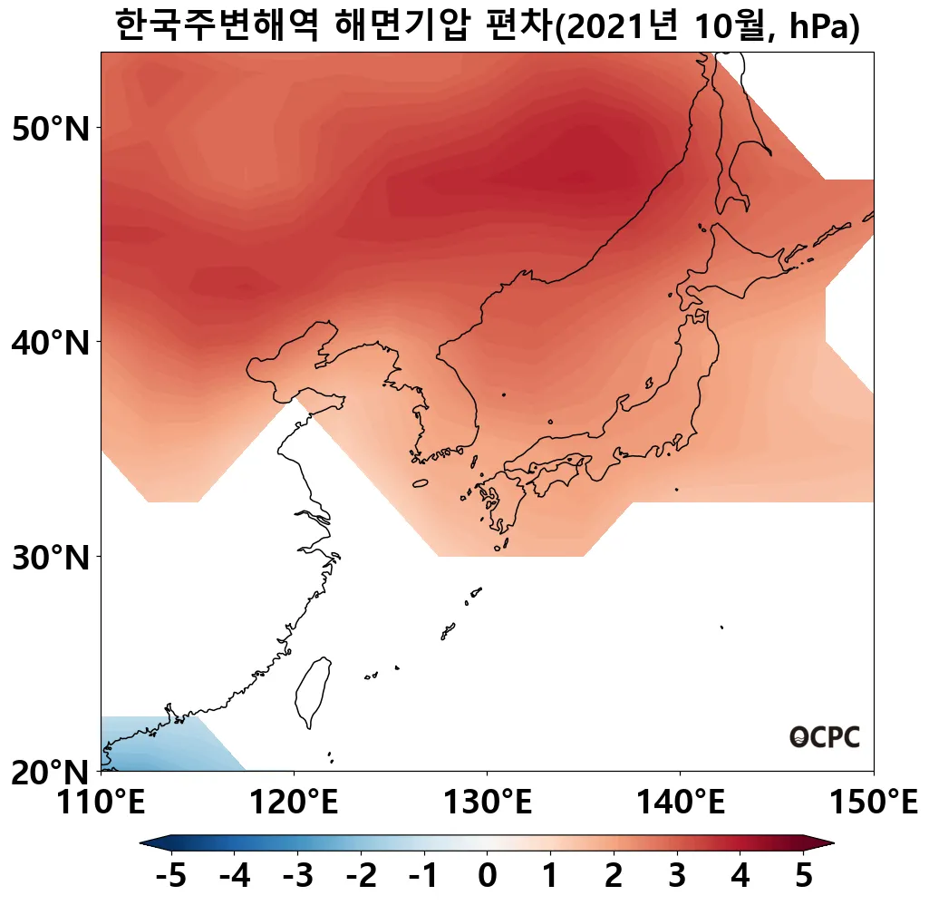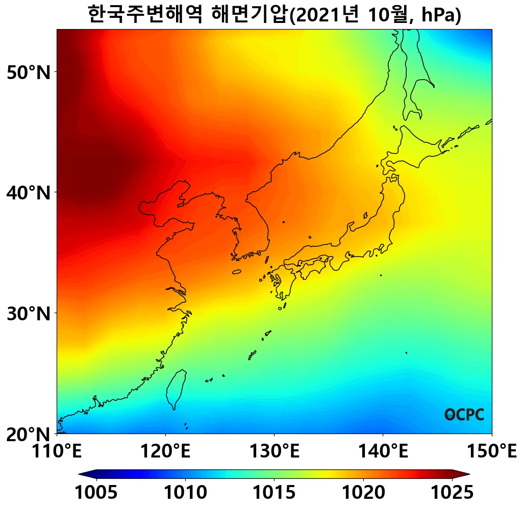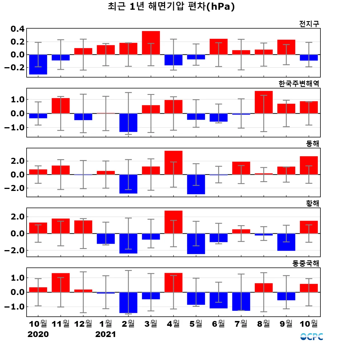 최근 30년 동안 한국주변해역과 동해, 황해의 10월 해면기압은 10년에 0.5hPa, 0.2hPa씩 증가하는 추세이며, 동중국해는 10년에 0.1hPa씩 감소하는 추세입니다.