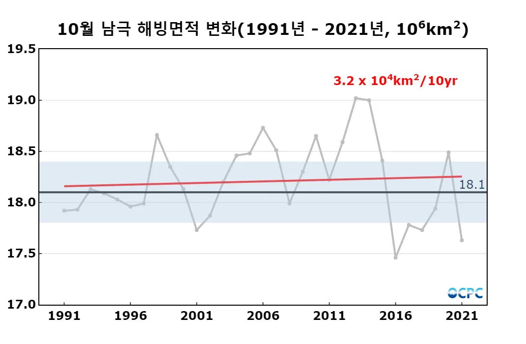 최근 30년 동안 10월 남극 해빙면적 변화 경향은 10년에 3.2만km²씩 증가하는 추세입니다.
