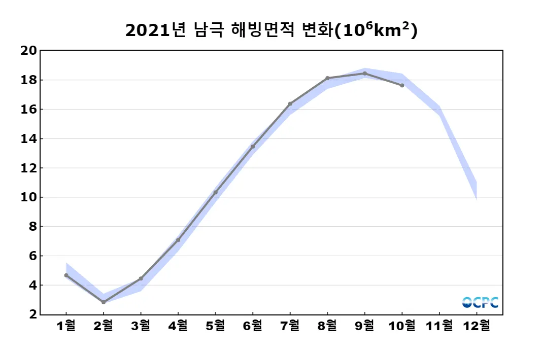 남극 해빙면적은 1,763만km²로 평년(1,810만km²)보다 47만km²(2.6%) 작았습니다.