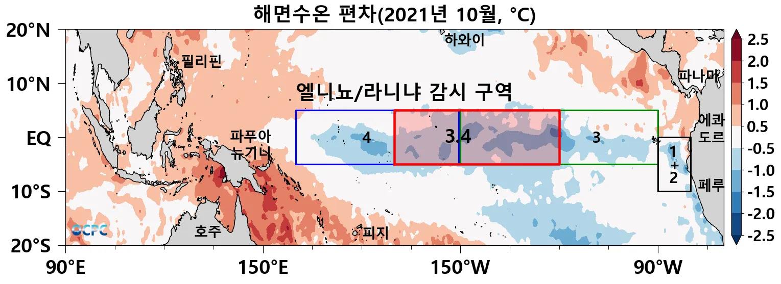 엘니뇨/라니냐 감시구역인 열대태평양 Nino3.4 해역(5°S~5°N, 170°W~120°W)의 10월 평균 해면수온 편차는 라니냐에 해당합니다.