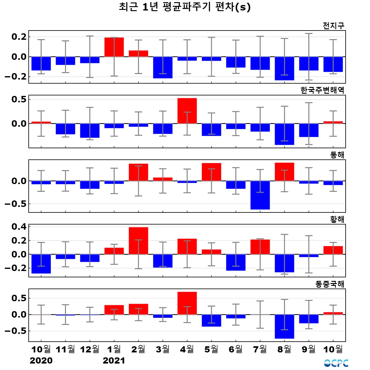 전지구, 한국주변해역, 동해, 황해, 동중국해의 평균파주기는 평년과 비슷했습니다.