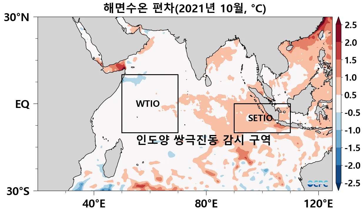 2021년 10월 평균 해면수온의 평년 대비 편차 (숫자가 표시된 사각형은 인도양 쌍극진동 감시구역으로 각각 WTIO(열대서인도양), SETIO(열대 남동인도양) 해역이며, DMI 지수는 WTIO의 평년 대비 편차에서 SETIO의 평년 대비 편차를 뺀 값임)