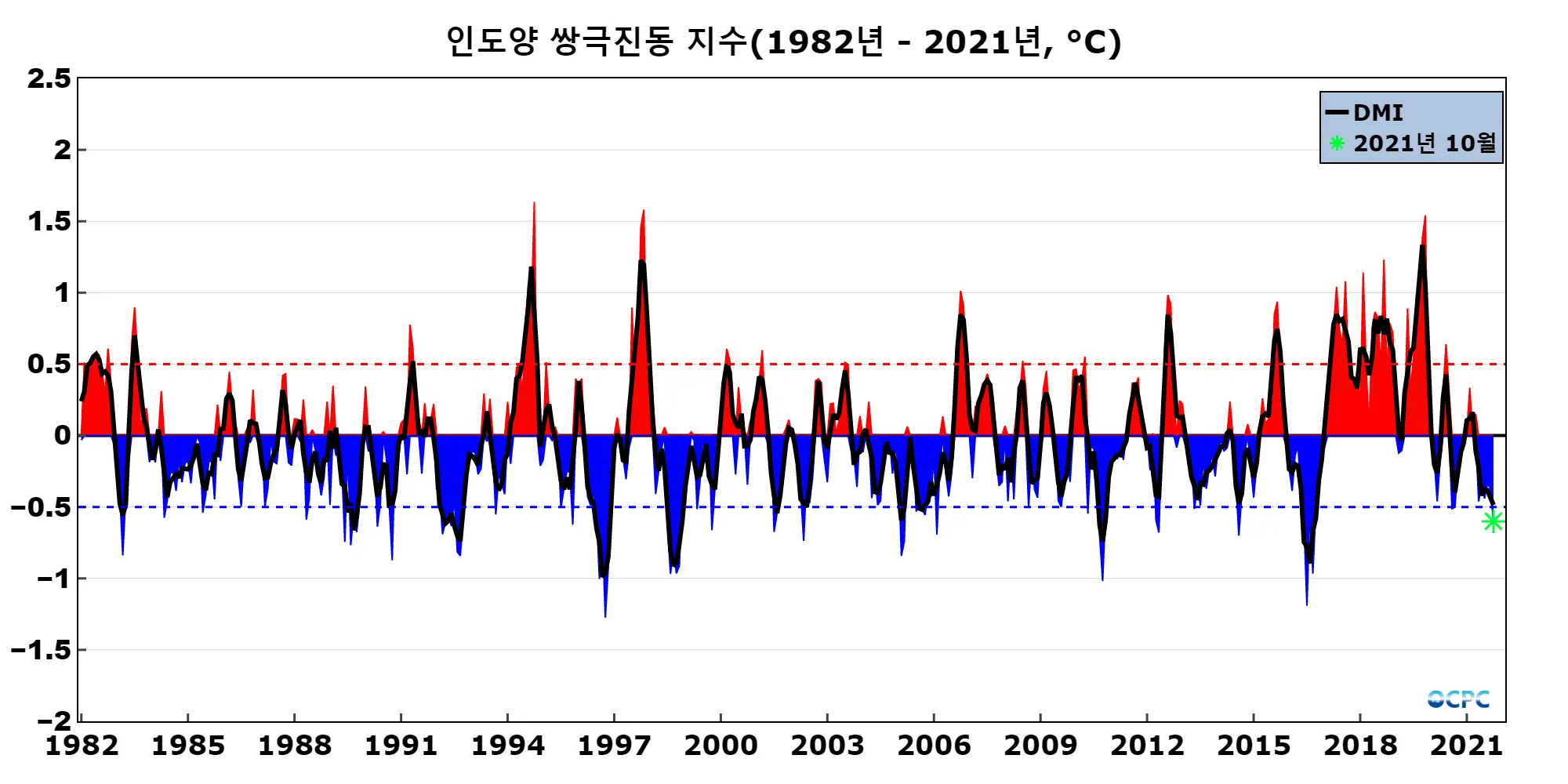 인도양 쌍극진동 지수 DMI (Dipole Mode Index)는 WTIO의 평년 대비 편차에서 SETIO의 평년 대비 편차를 뺀 값으로 OCPC에서는 월평균 지수(채색부분)를 3개월 이동평균하여 나타낸 지수(검정선)가 0.5보다 크면 양의 상태로, -0.5보다 작으면 음의 상태로 판정합니다.
