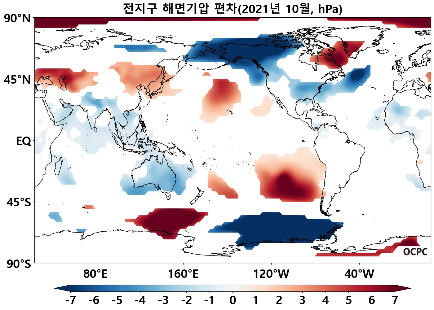 전지구 평균 해면기압은 평년(1010.8hPa)과 비슷했으며, 공간적으로는 태평양 중위도(20°S~45°S, 20°N~45°N) 해역에서 평년보다 높았습니다.