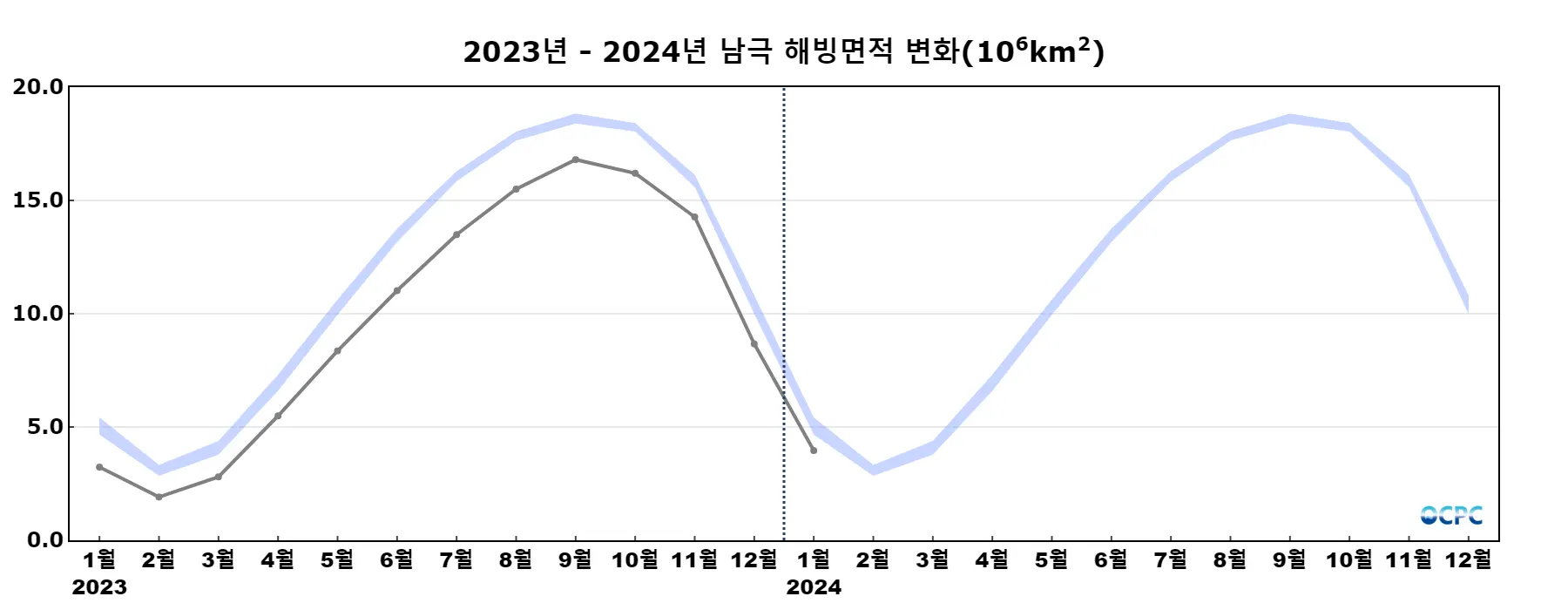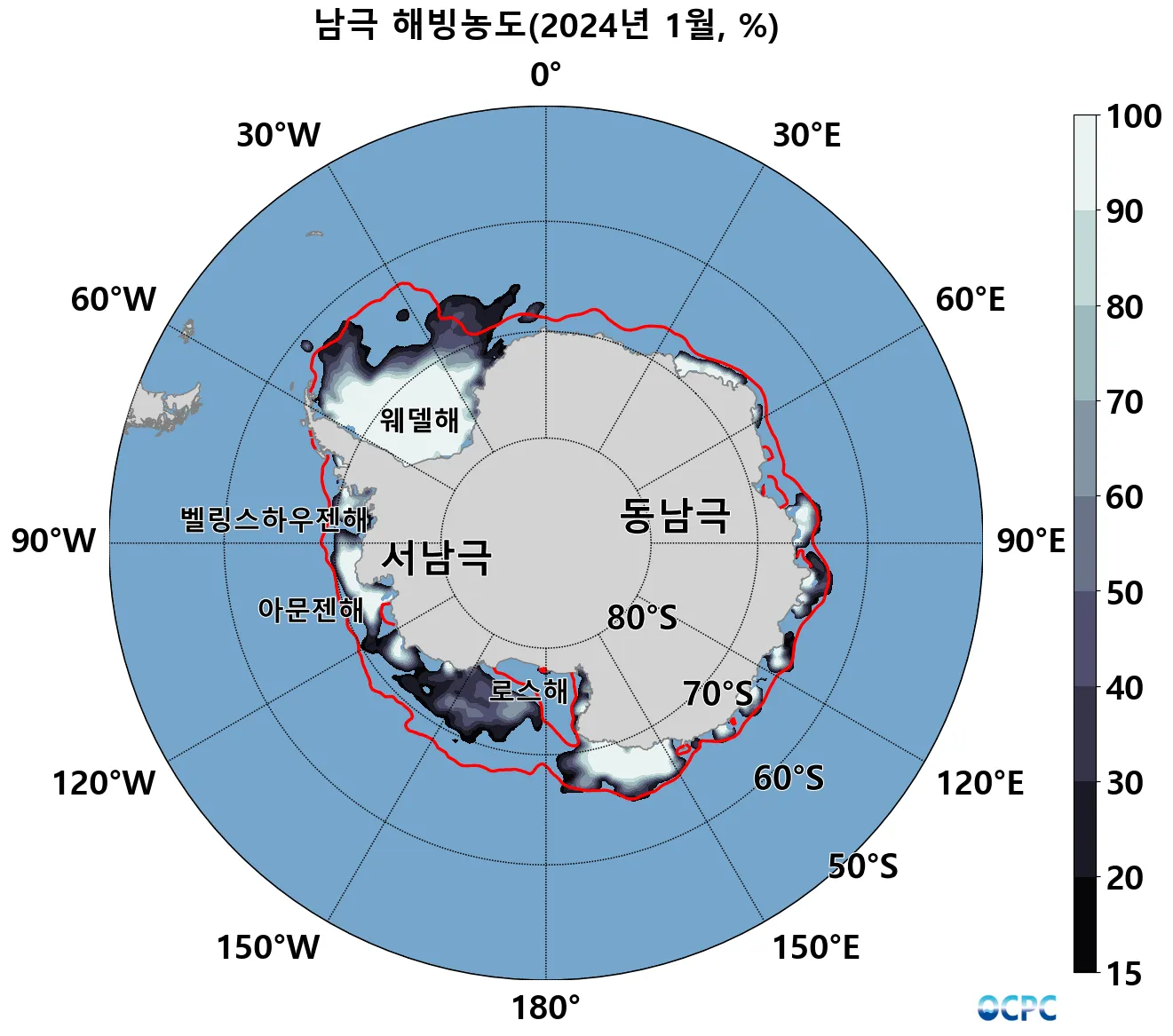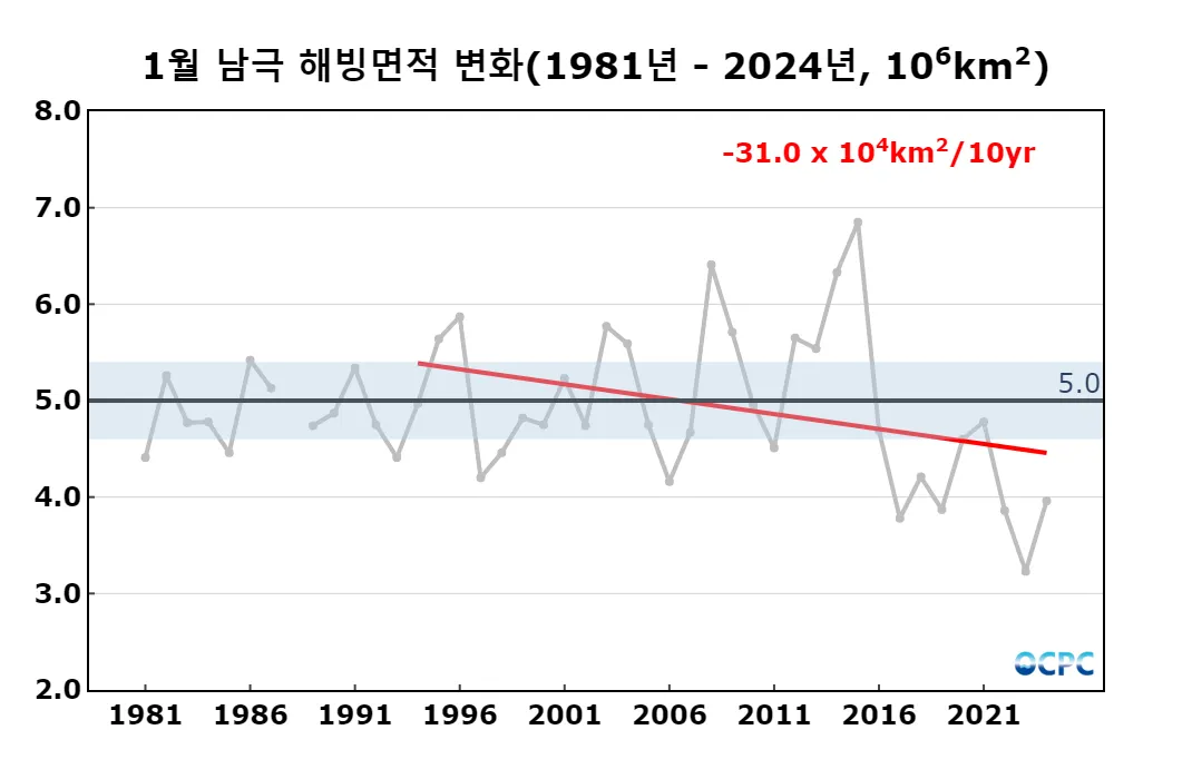 1월 남극 해빙면적은 1994~2024년 동안 10년에 31만km²씩 감소하는 추세입니다.