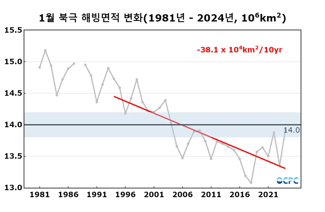1994~2024년 동안 1월 북극 해빙면적은 10년에 38만km²씩 감소하는 추세입니다.