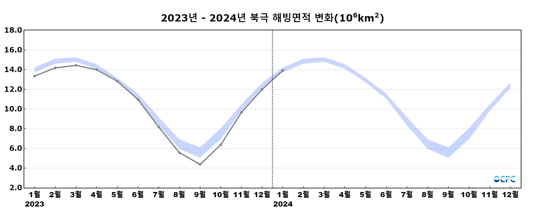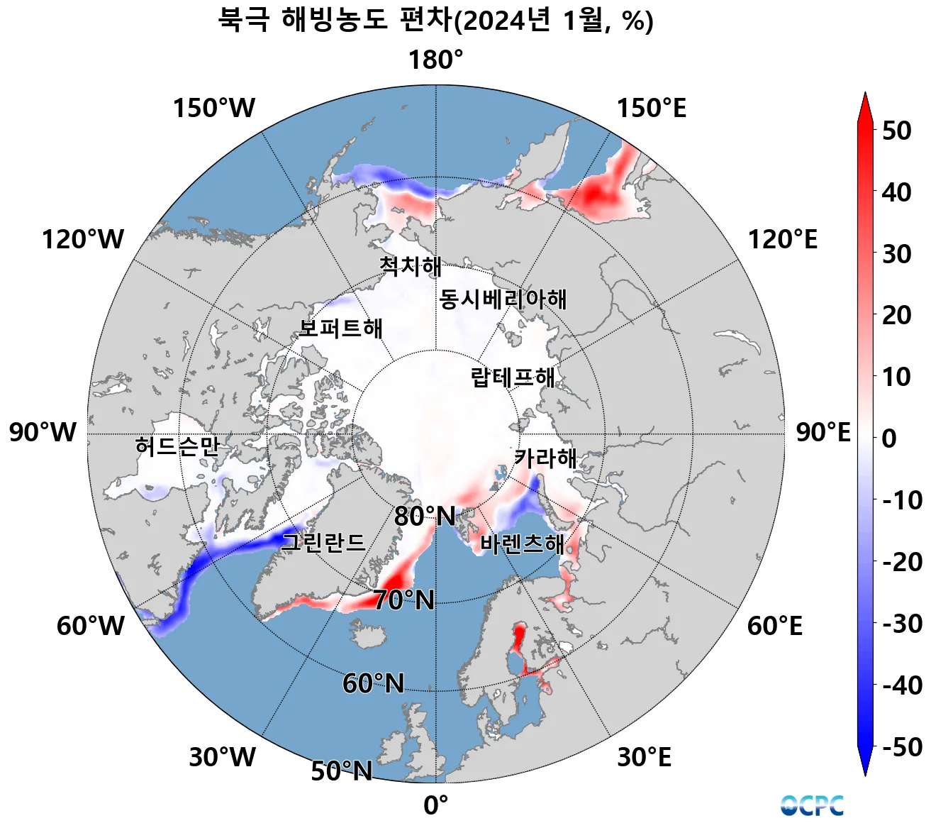 바렌츠, 그린란드 서쪽, 베링해에서 해빙농도가 평년대비 낮은 편차를 보이는 반면, 이를 제외한 대부분의 해역에서 평년대비 높은 편차를 보임에 따라 북극 전체 평균 해빙면적은 평년 수준의 값을 보이고 있습니다.