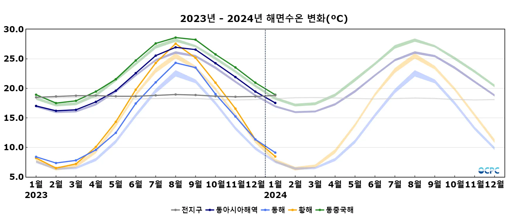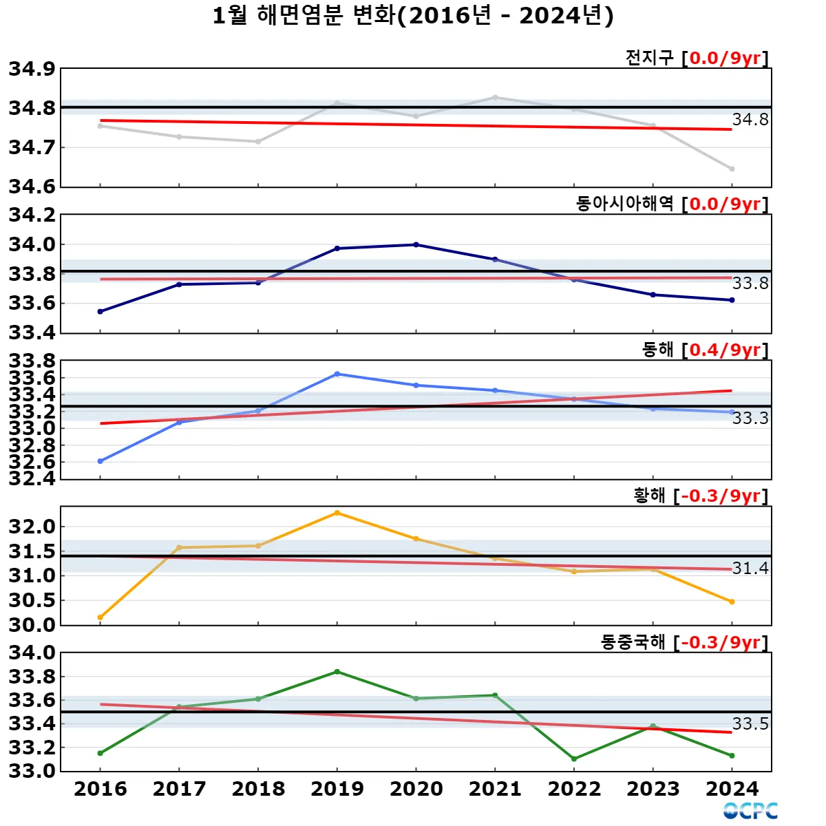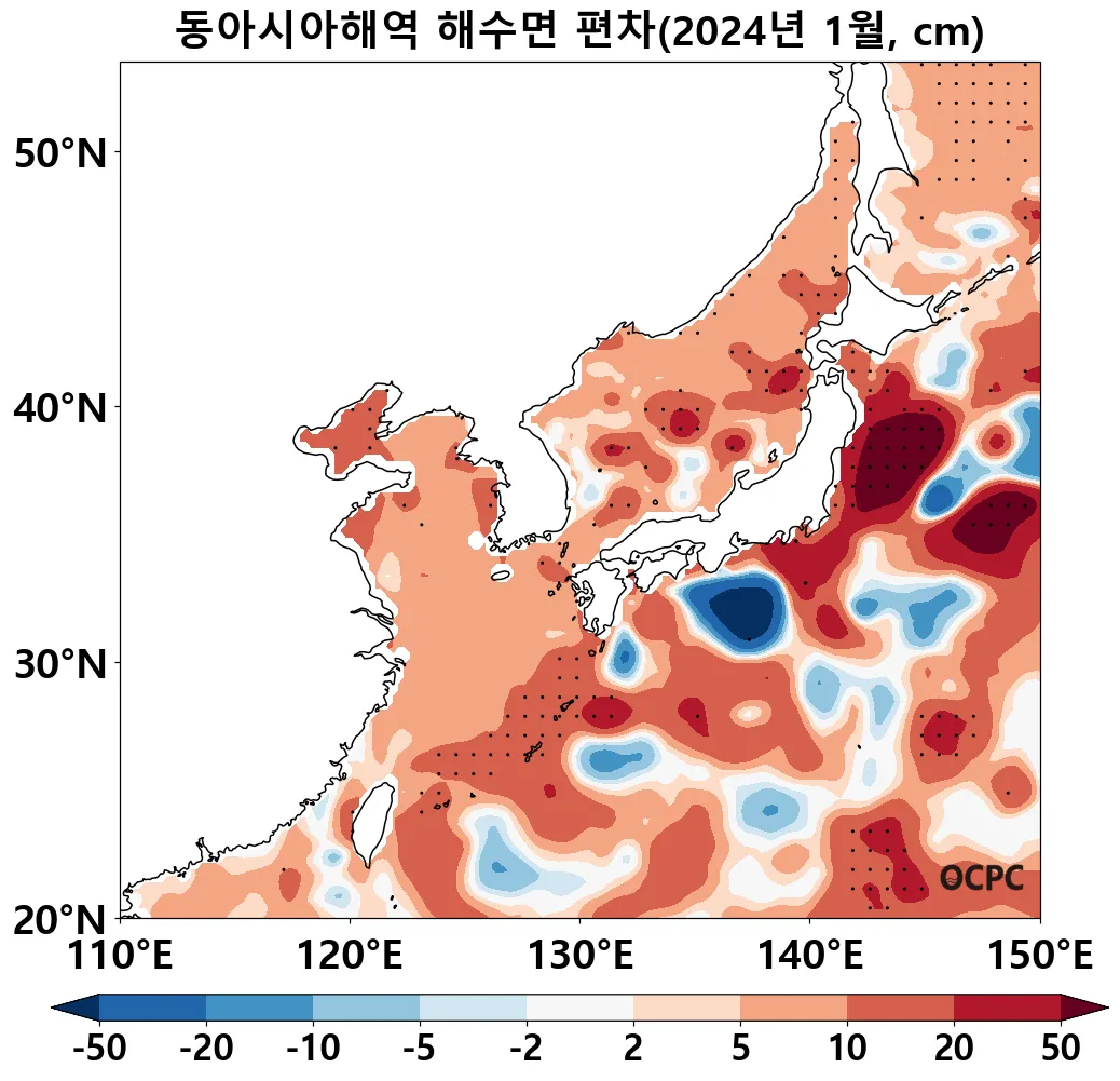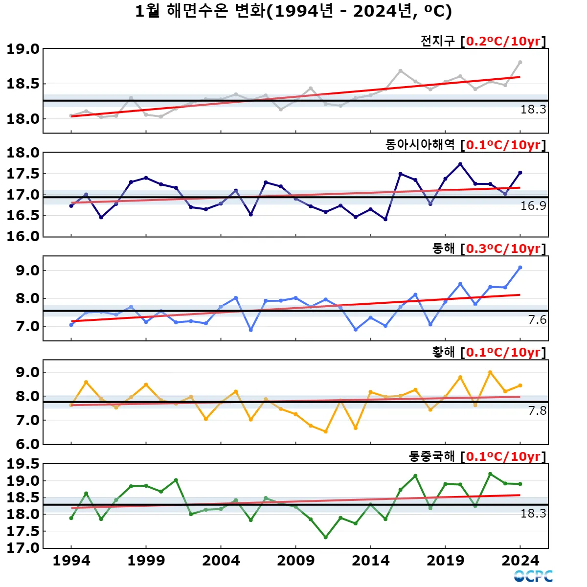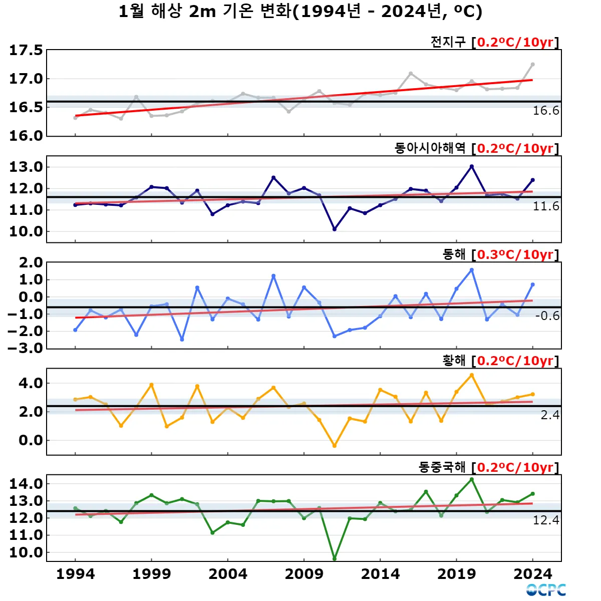 1994~2024년 동안 전지구 1월 해면수온은 10년에 0.2°C씩 증가하는 추세이며, 동아시아해역의 추세는 10년에 0.1~0.3°C로 그 중 동해의 상승률이 가장 큽니다.
