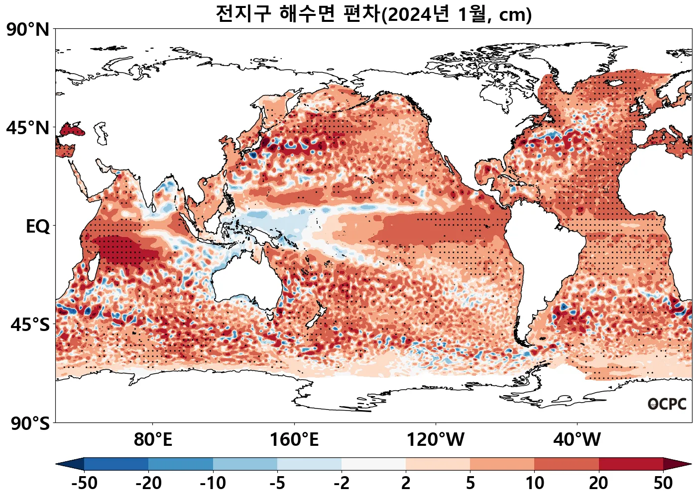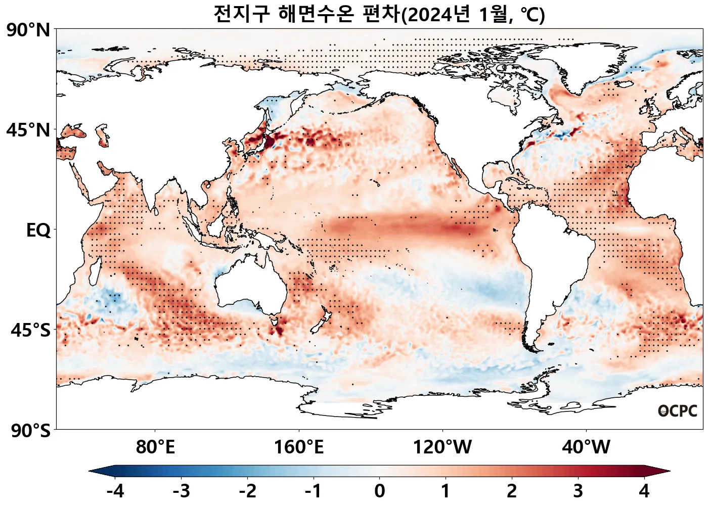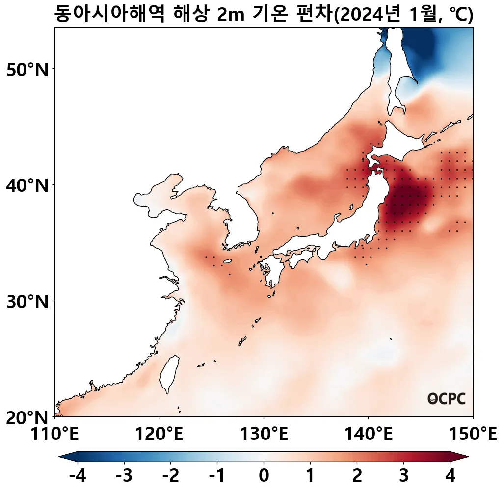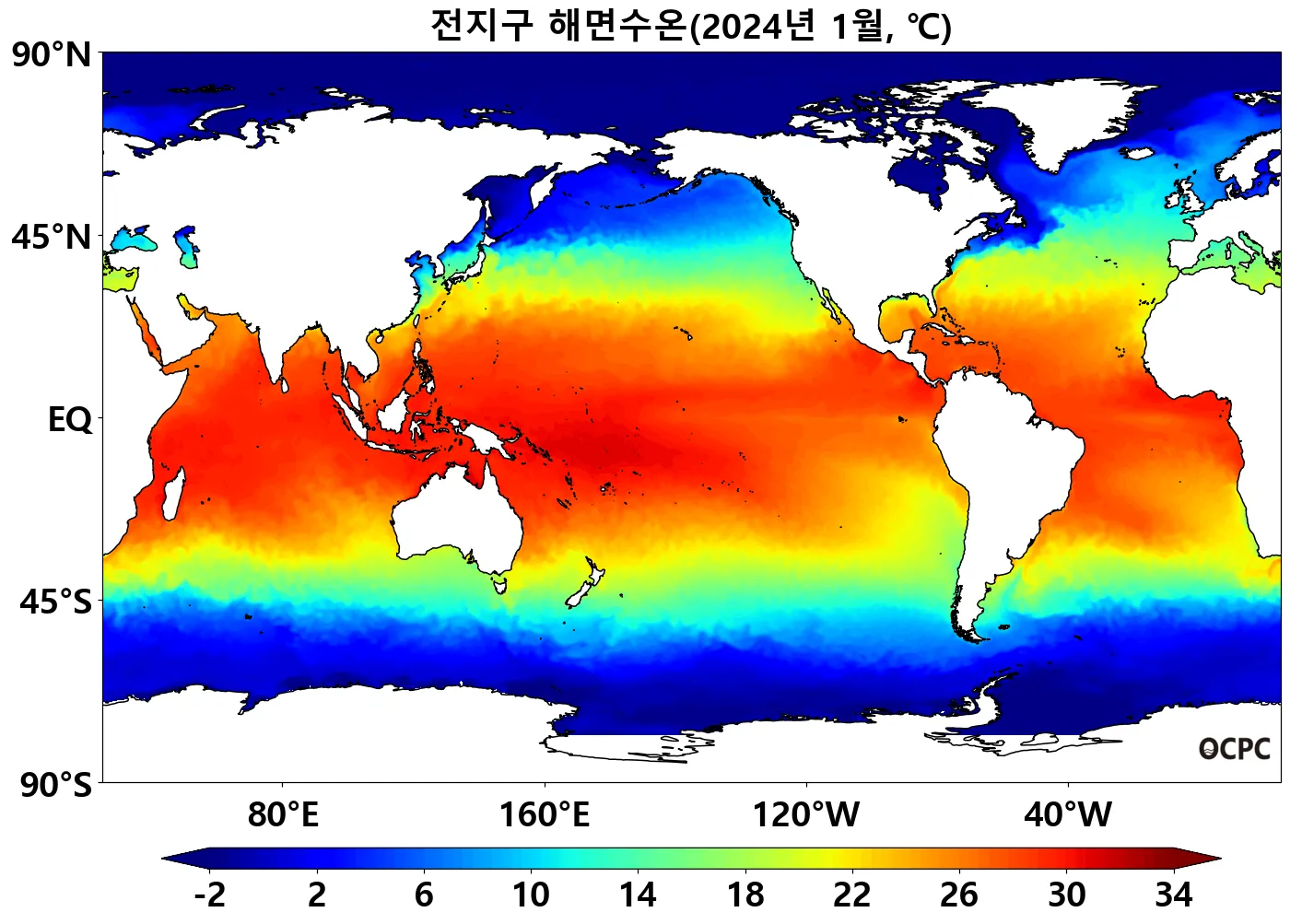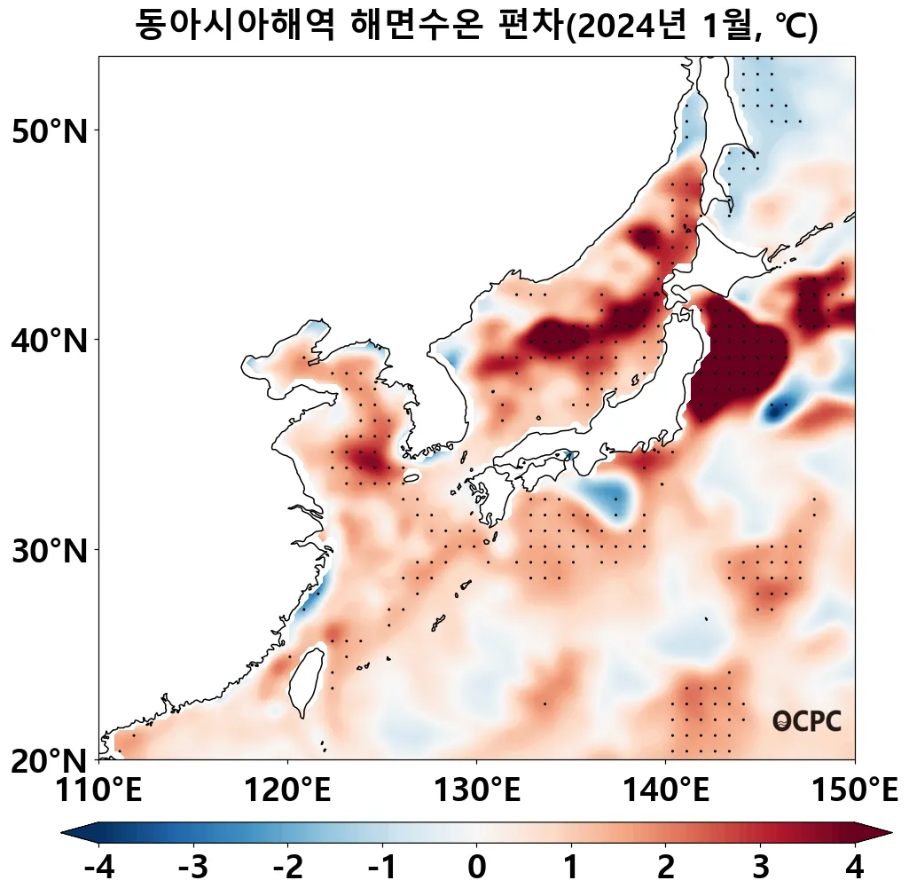 1994~2024년 동안 전지구 1월 해면수온은 10년에 0.2°C씩 증가하는 추세이며, 동아시아해역의 추세는 10년에 0.1~0.3°C로 그 중 동해의 상승률이 가장 큽니다.