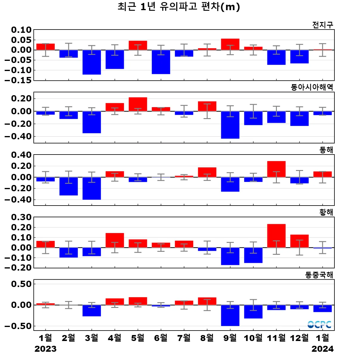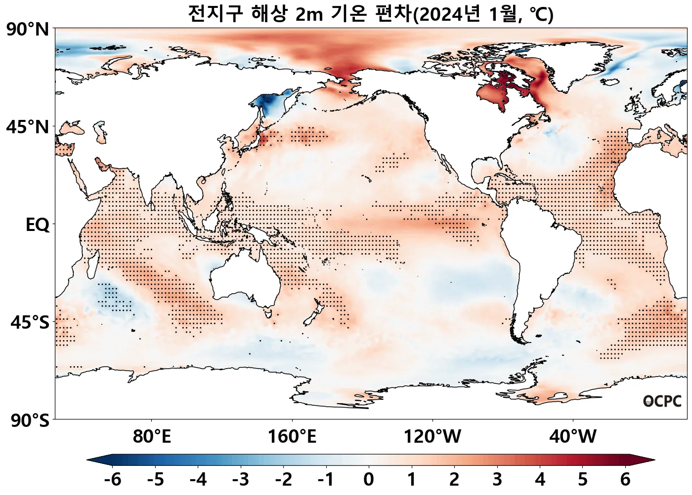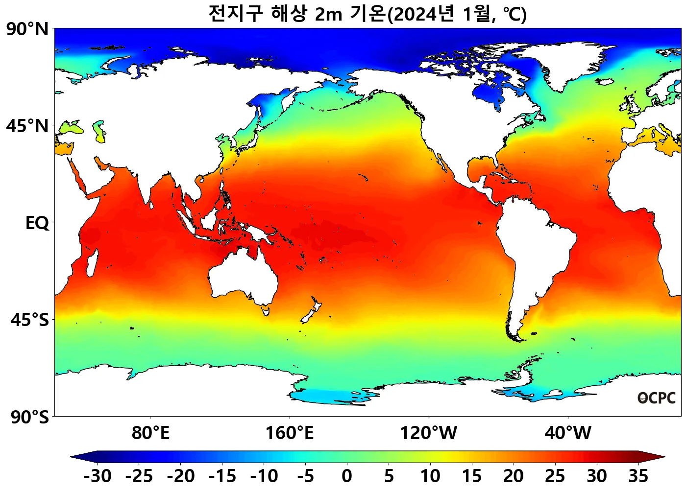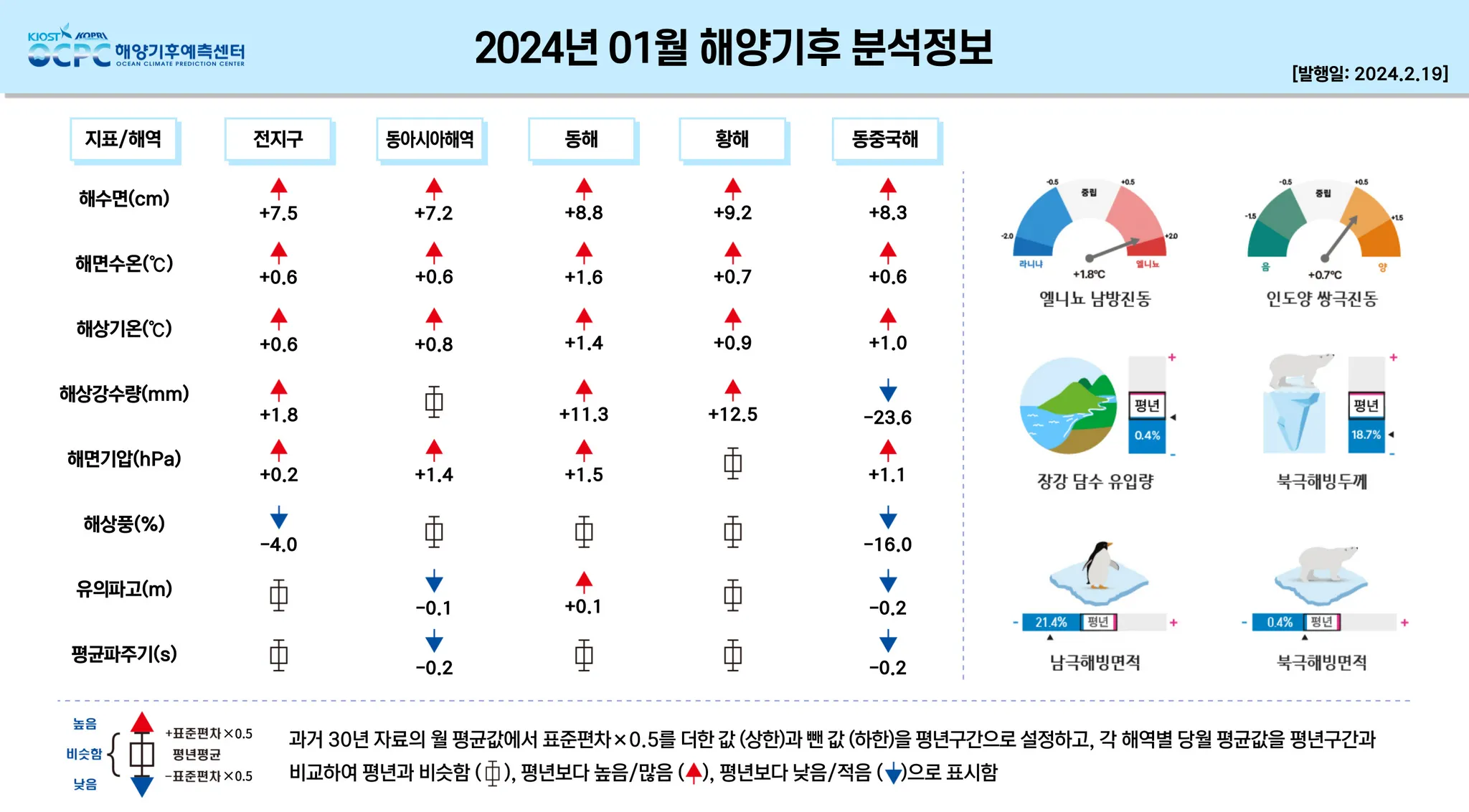요약 : 전지구 해수면, 해면수온, 해상기온은 역대 1월 중 가장 높았습니다. 동해의 대부분 해상에서는 해양열파가 장기간 지속되고 있으며, 동해와 쿠로시오확장역의 고수온이 계속 유지되고 있습니다. 열대 태평양 엘니뇨 감시해역 해면수온 편차는 계속해서 강하게 유지되고 있습니다.
