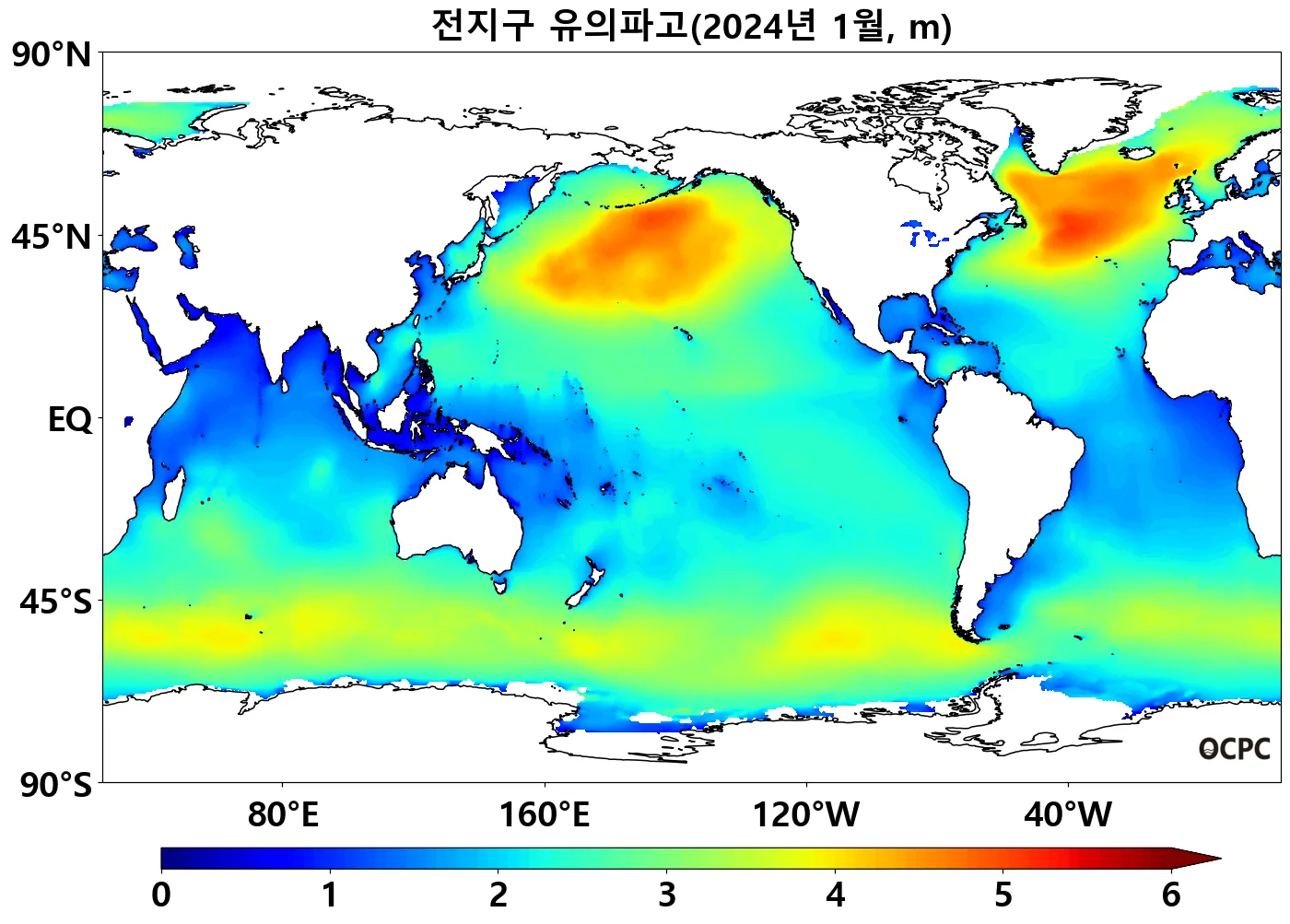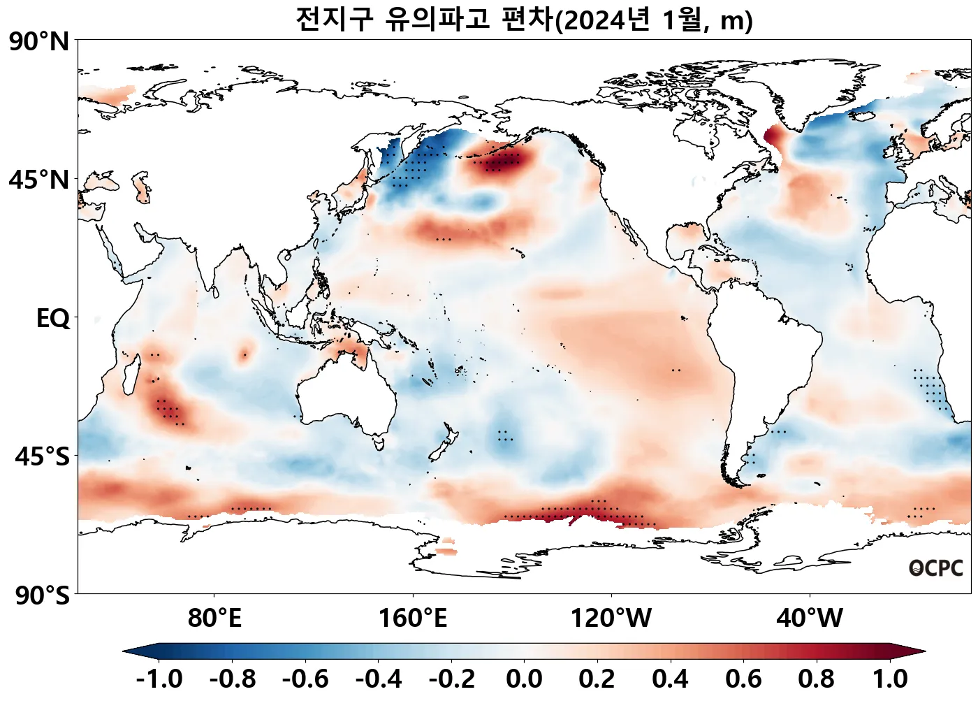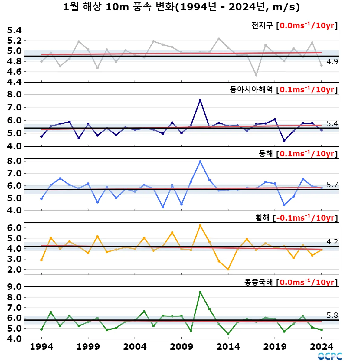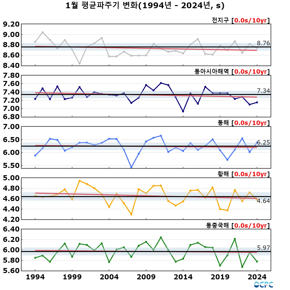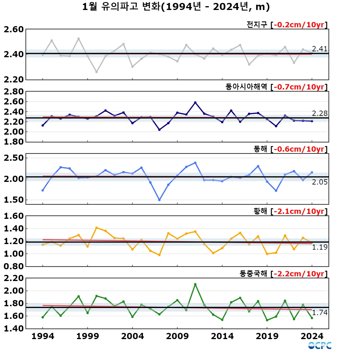 1994~2024년 동안 전지구 및 동아시아해역의 1월 평균 유의파고는 10년에 각각 0.2cm, 0.7cm씩 감소하는 추세입니다.