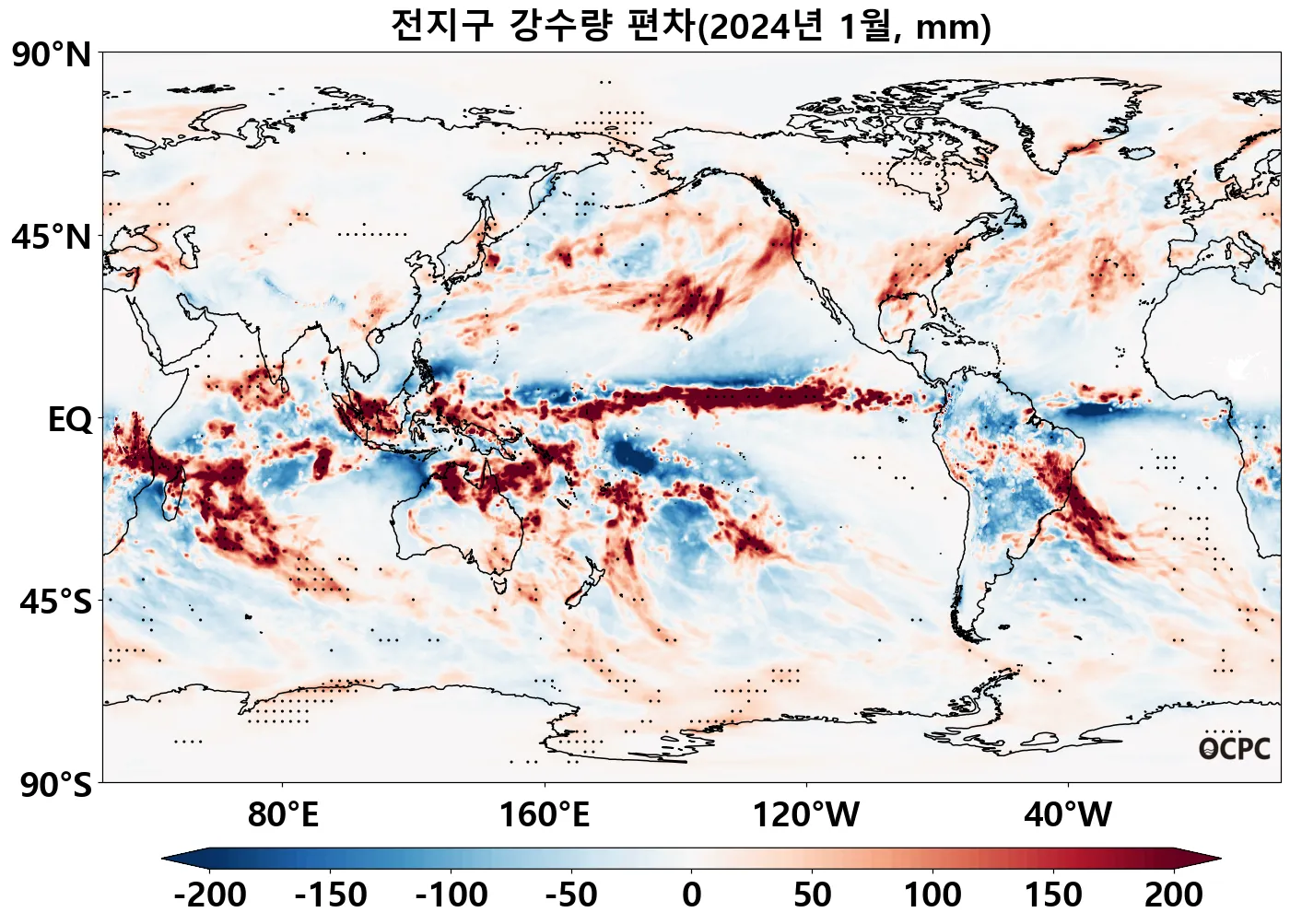 전지구 평균 해면수온은 평년(18.3±0.1°C)보다 0.6°C 높아 1982~2024년(1월) 중 가장 높았습니다. 특히 북태평양 중위도 해역(160°E~160°W, 30°N~60°N), 열대 동태평양(75°W~120°W, 0°S~30°S)에서 양의 해면수온 편차가 크게 나타납니다. 엘니뇨와 IOD의 영향으로 인도양(40°E~70°W, 10°S~15°N) 및 남인도양(50E°~100°E, 25°S~40°S)에서도 높은 양의 해면수온 편차가 나타납니다.