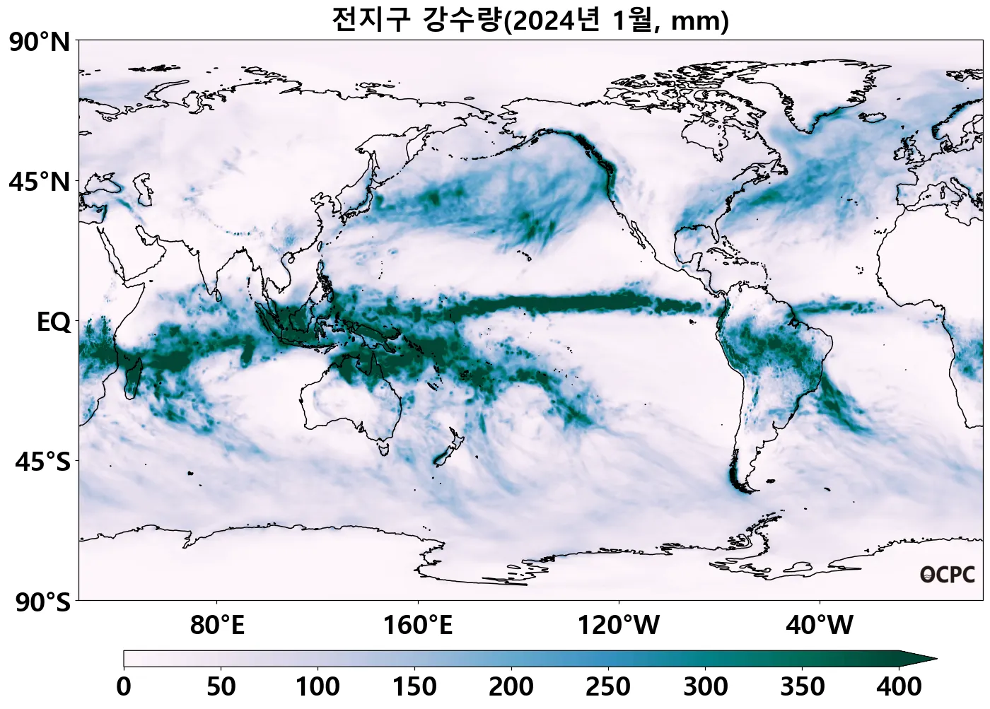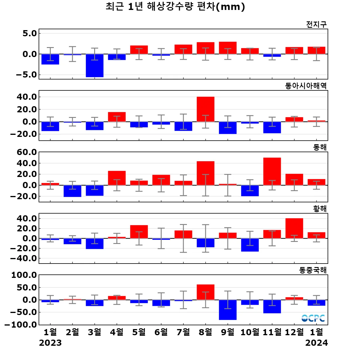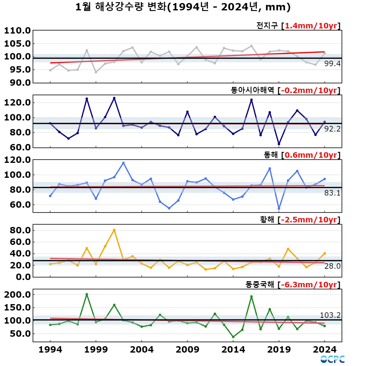 1994~2024년 동안 전지구 1월 해상강수량은 10년에 1.4mm, 황해, 동중국해는 10년에 2.5~6.3mm씩 감소하는 추세이며, 동해는 10년에 0.6mm씩 증가하는 추세입니다.