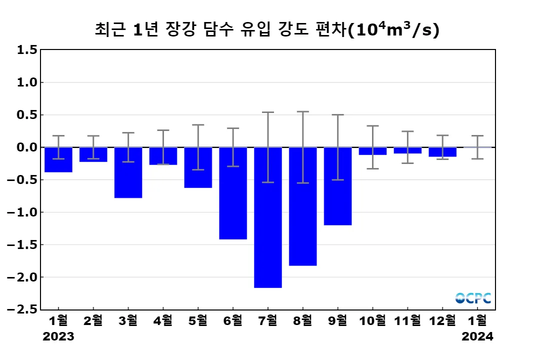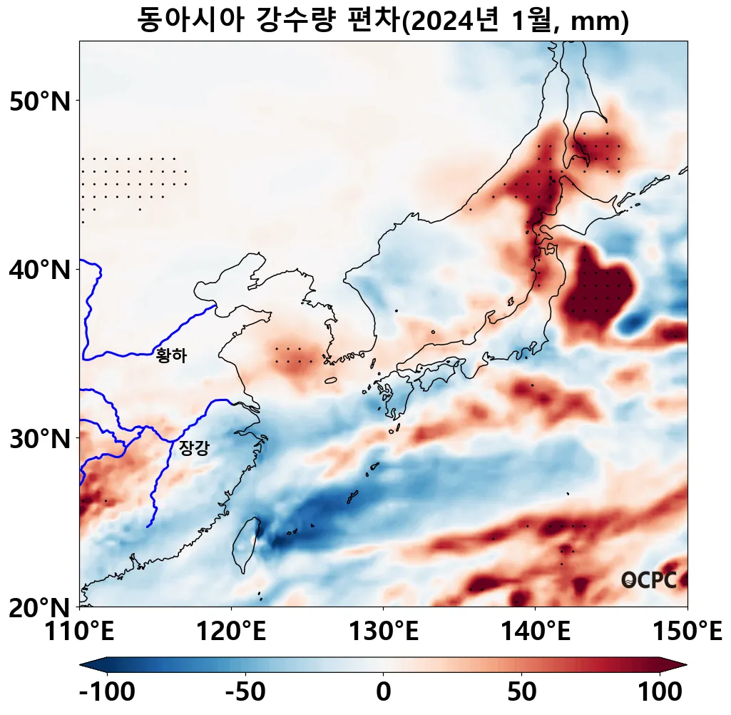 중국 장강 유역(110ºE~120ºE, 29ºN~32ºN) 월누적 강수량은 지난 12월보다 상승함에 따라 담수 유입 강도 편차도 상승한 것으로 판단됩니다.