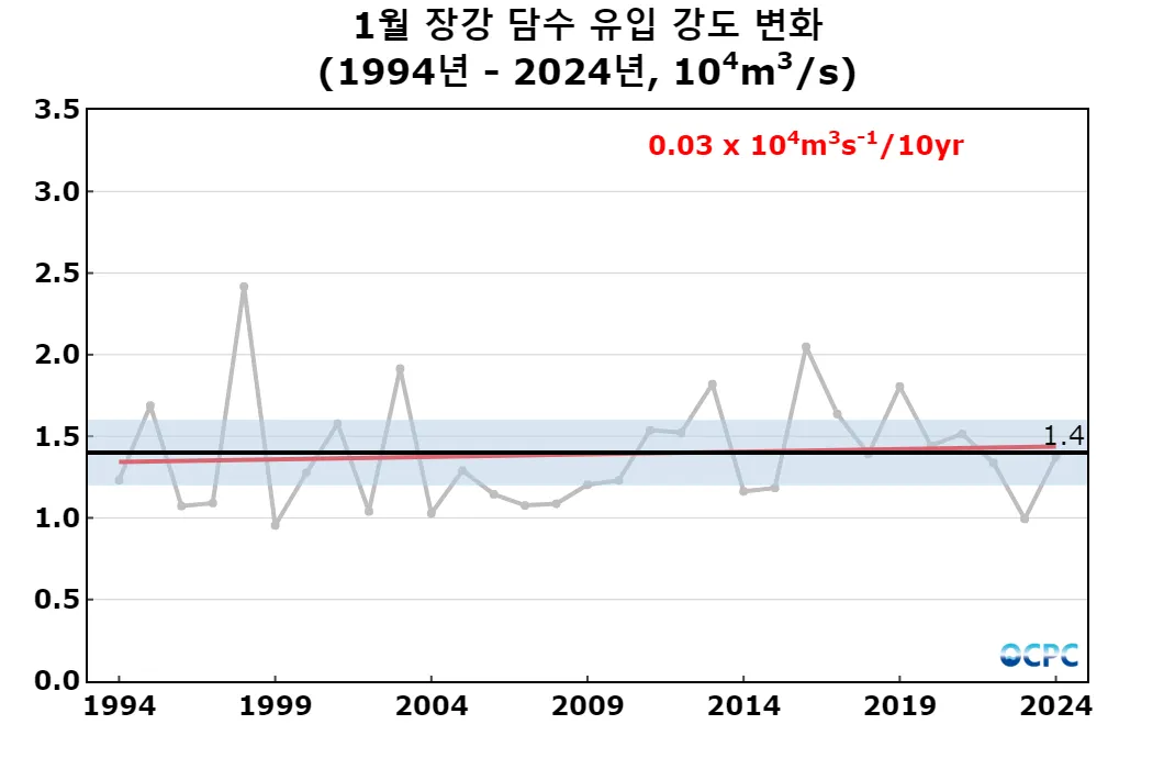 1994~2024년 동안 1월 장강 담수 유입 강도는 10년에 초당 300톤(한 달 동안 유입된 담수량으로 환산하면 10년에 0.8기가톤)씩 증가하는 추세입니다.