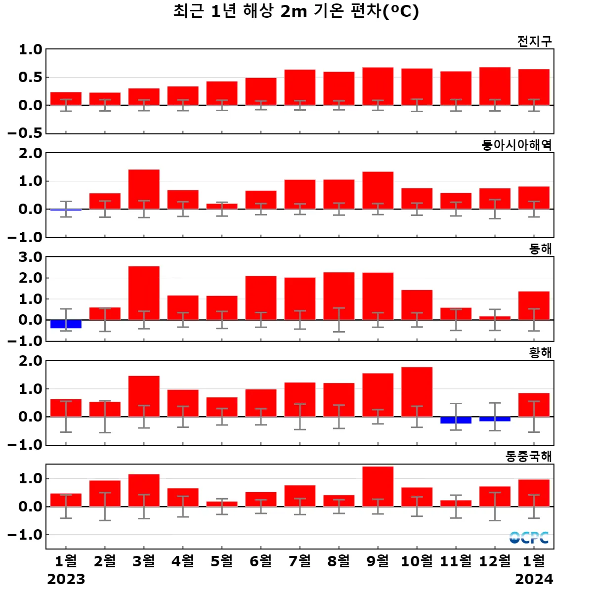 동해, 황해, 동중국해의 해상기온은 평년(-0.6±0.2°C, 2.4±0.3°C, 12.4±0.2°C)보다 각각 1.4°C, 0.9°C, 1.0°C 높았습니다.