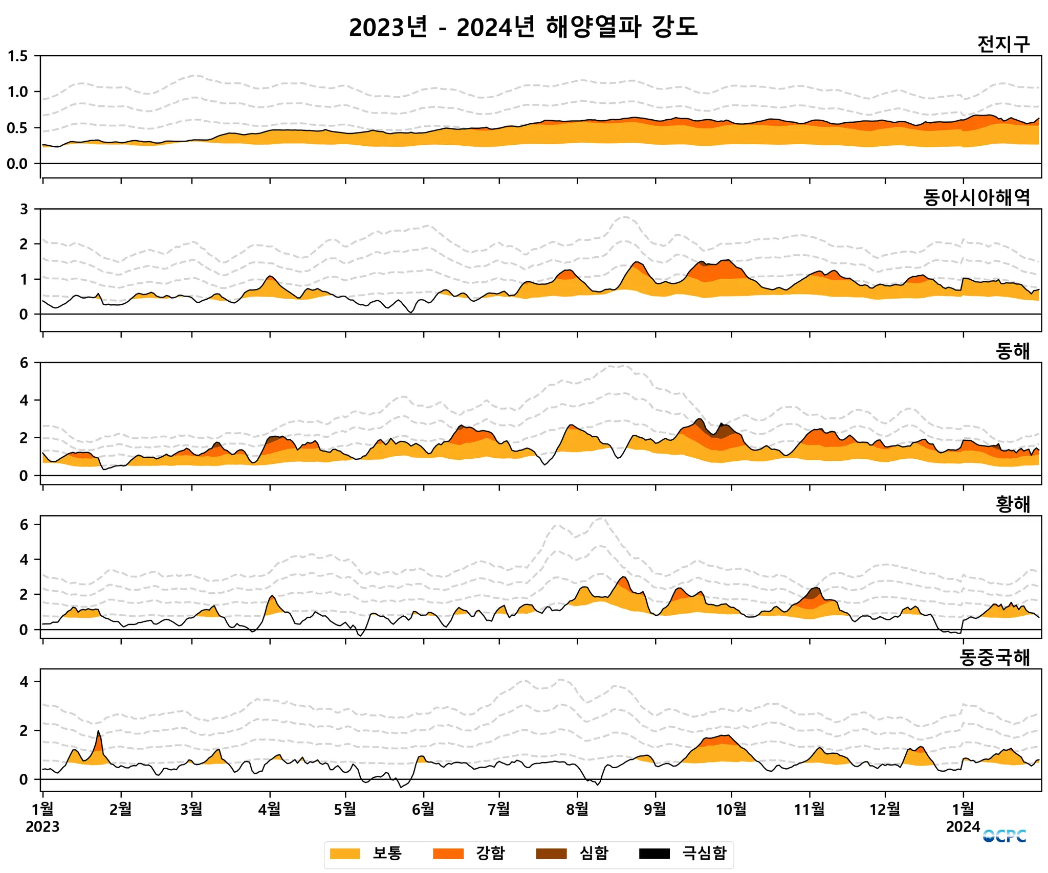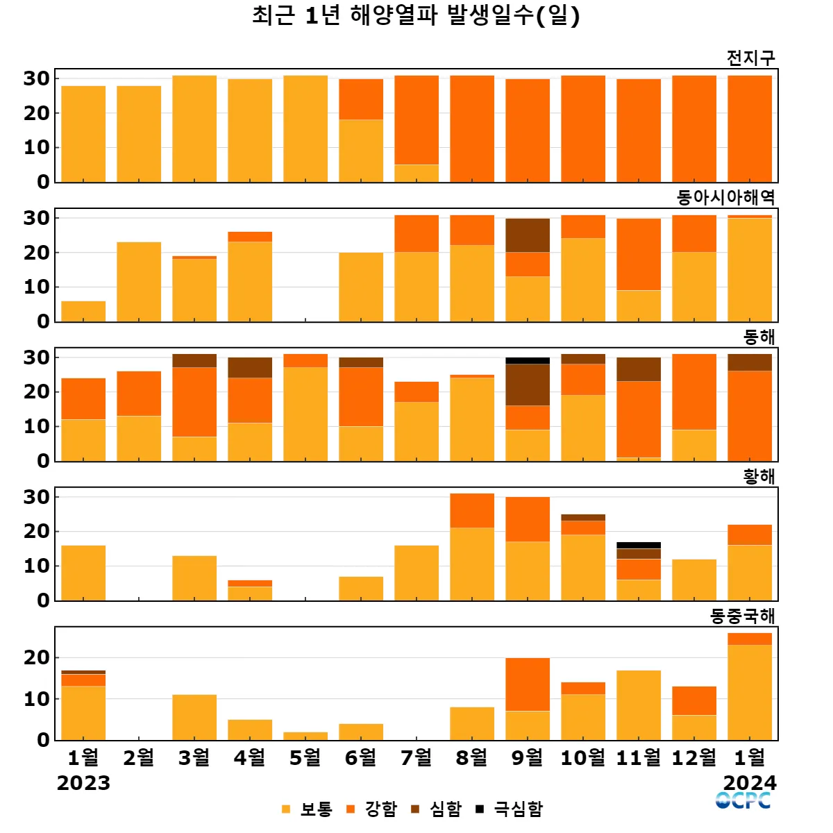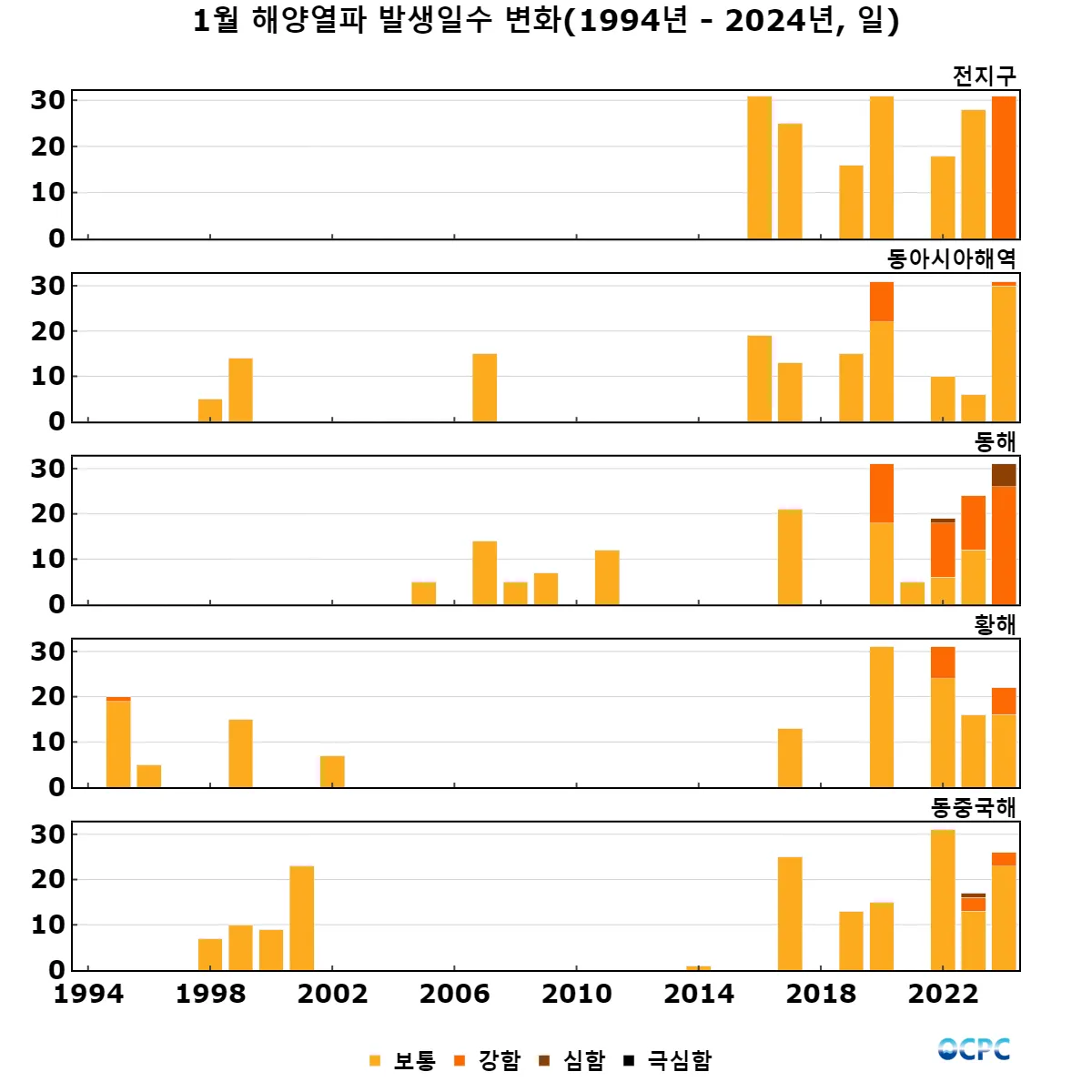전지구 및 동아시아의 1월 해양열파는 2016년 이후 잦은 빈도로 발생하며 강도는 높아지고 있습니다.