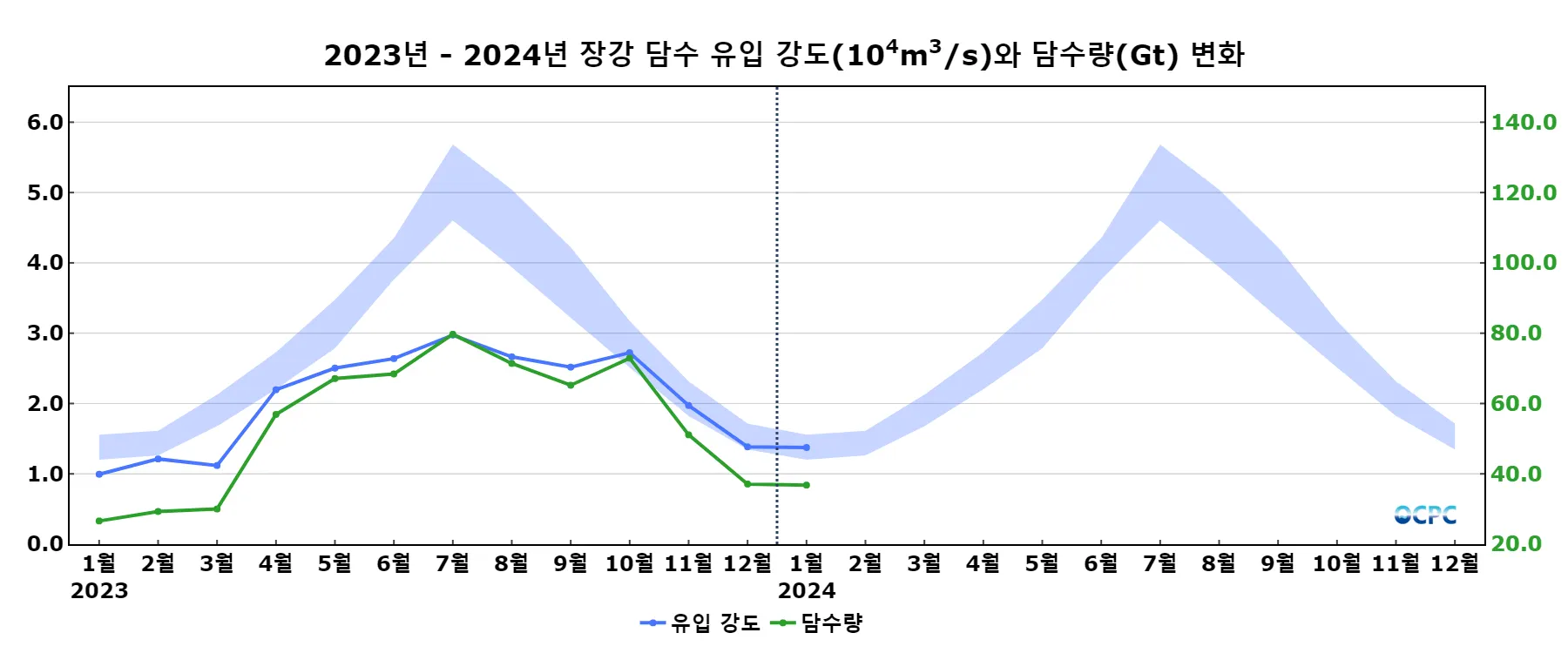 1월 한 달 동안 동중국해로 유입된 담수량으로 환산하면, 36.8기가톤(1Gt=10⁹m³=1km³)으로 평년(37.0±9.5기가톤)과 비슷했습니다.