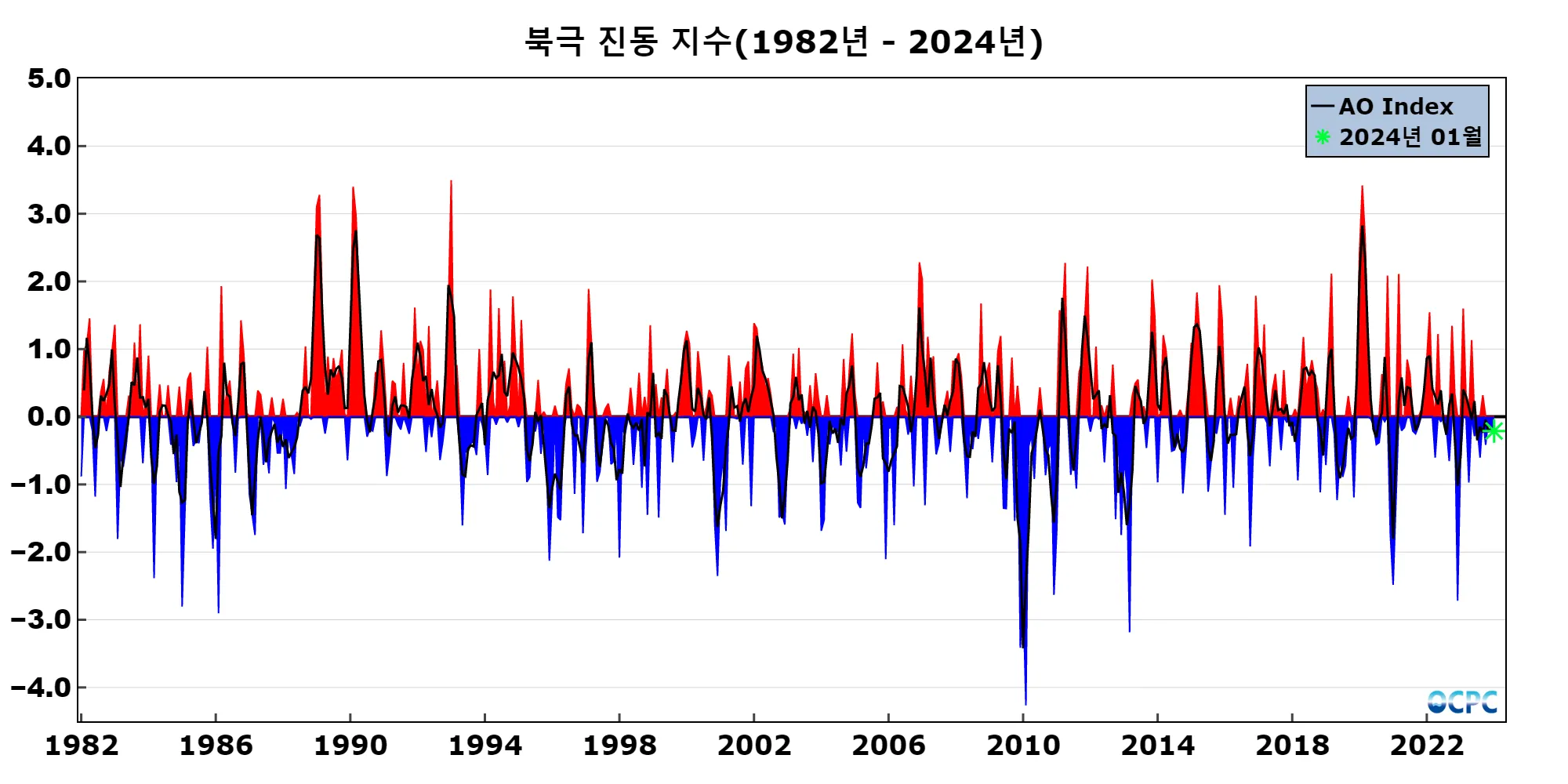 1월 북극진동 지수는 -0.2로 약한 음의 상태입니다.