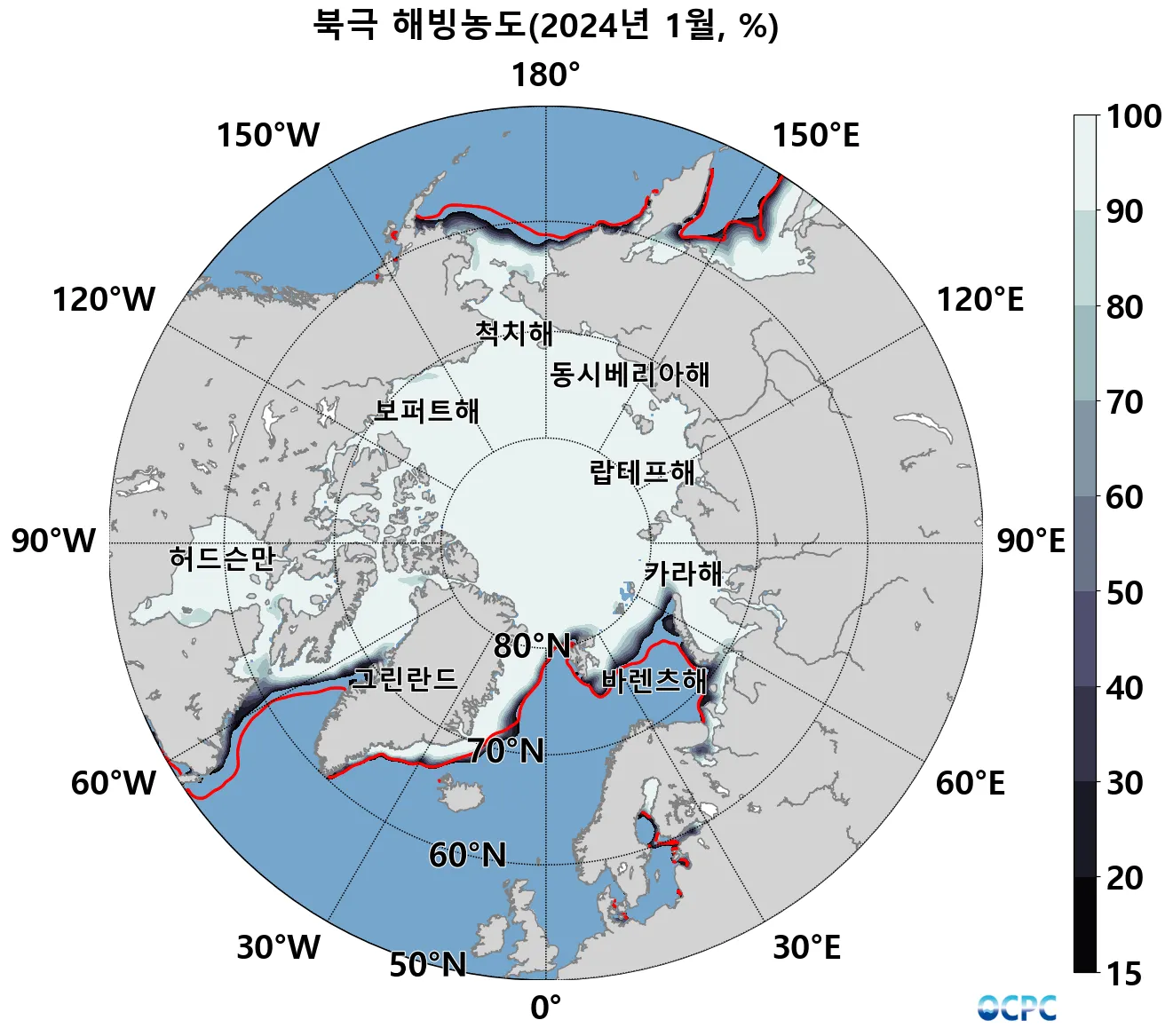 해빙농도 15% 이상 해역, 붉은선(평년 해빙농도 15% 경계)