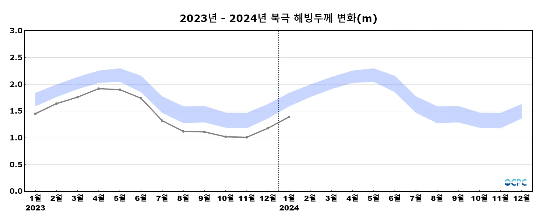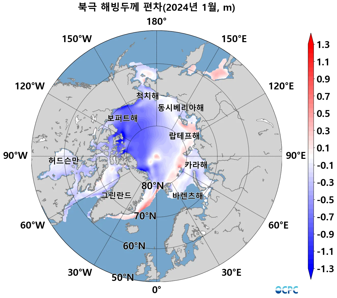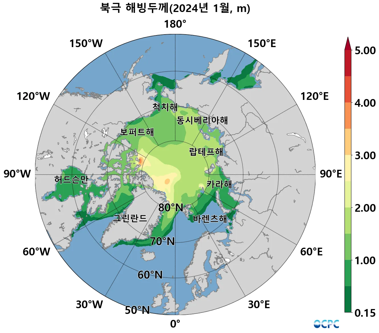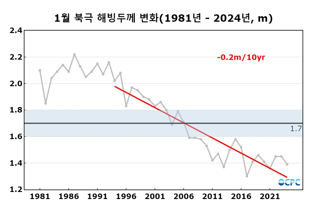 1월 북극 해빙두께는 1.4m로 평년(1.7±0.1m) 보다 약 0.3m(18.7%) 감소했으며, 1994~2024년 동안 10년에 0.2m씩 감소하는 추세입니다.