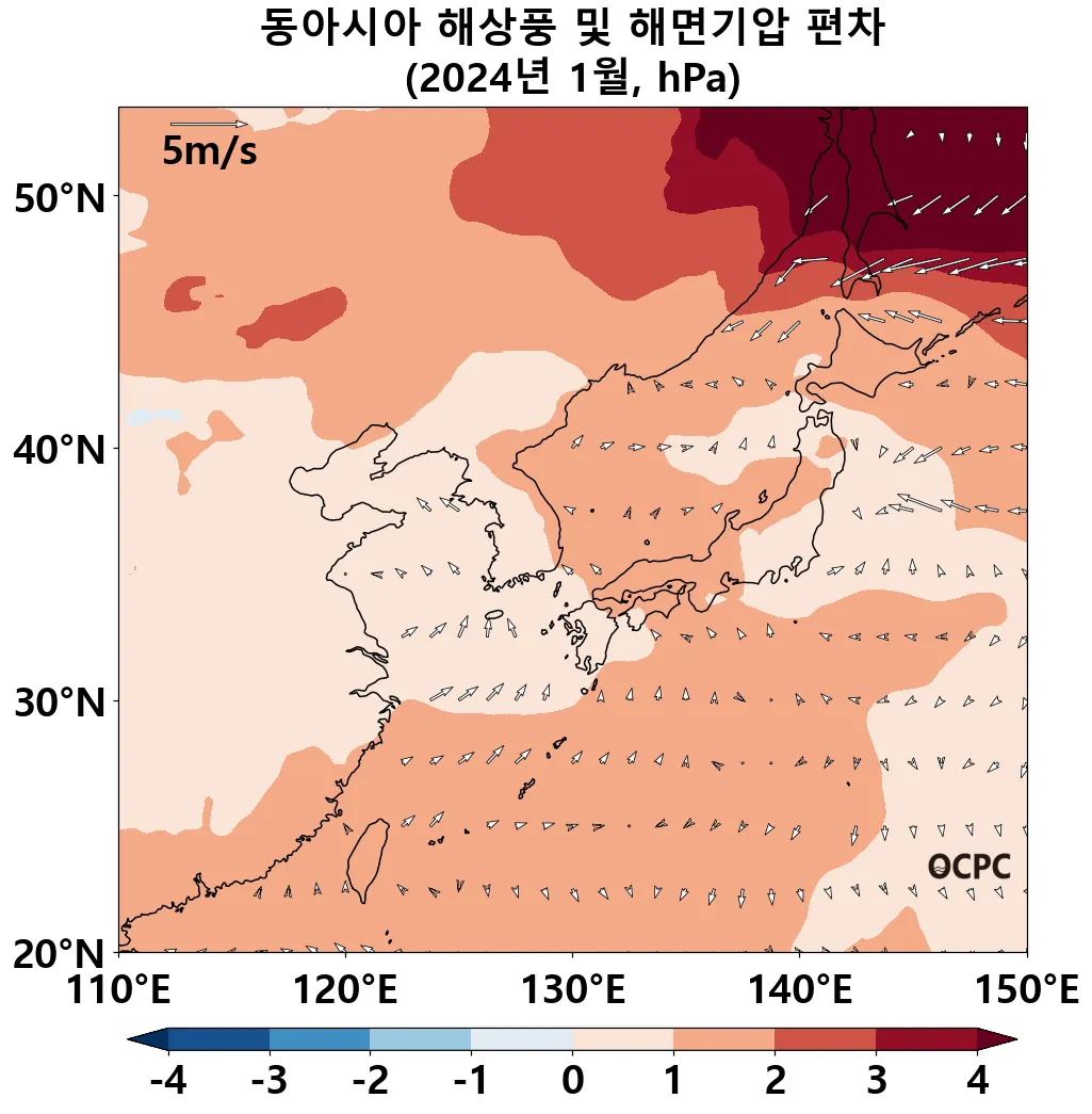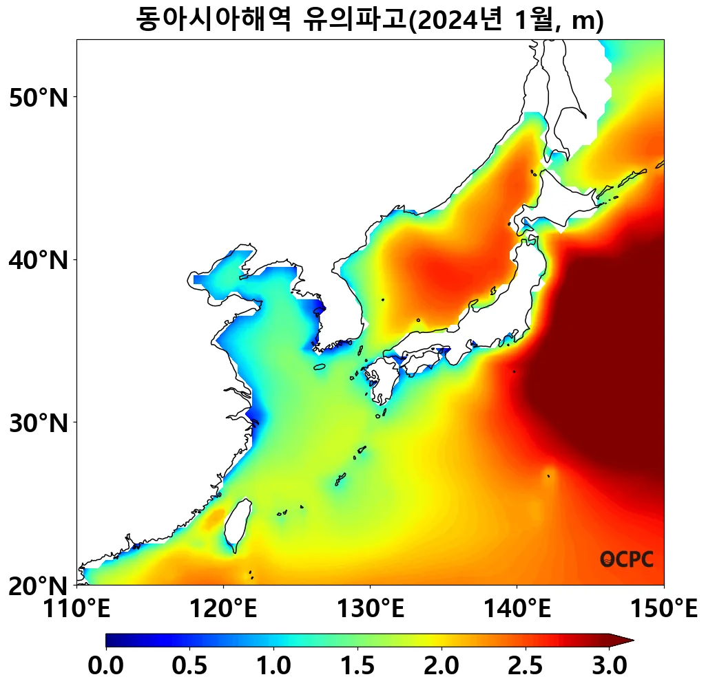 동해 대부분 해상에서는 지난 8월 말부터 시작된 해양열파가 장기간(164일)동안 지속되었으며 1월 중에는 ‘강함’~’심함’ 등급의 열파가 발생했습니다. 황해는 1월 8일에 시작된 열파가 22일간 지속되었으며 ‘보통’~’강함’ 등급으로 발생했습니다. 동중국해는 1월 1일에 시작된 열파가 26일간 지속되었으며 ‘보통’~’강함’ 등급으로 발생했습니다.