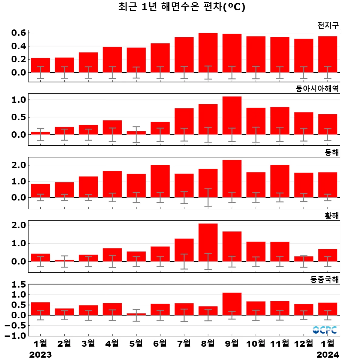 동아시아해역의 해상기온 편차는 최근 8개월 동안 평년 대비 높은 온도를 유지하고 있습니다.