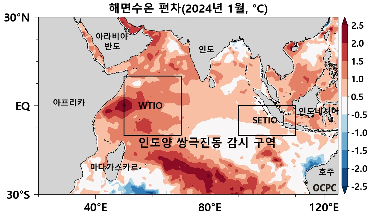 2024년 1월 평균 해면수온의 평년 대비 편차(사각형은 인도양 쌍극진동 감시구역으로 각각 WTIO(열대서인도양), SETIO(열대 남동인도양) 해역이며, 인도양 쌍극진동 지수(DMI: Dipole Mode Index)는 WTIO의 평년 대비 편차에서 SETIO의 평년 대비 편차를 뺀 값입니다.)