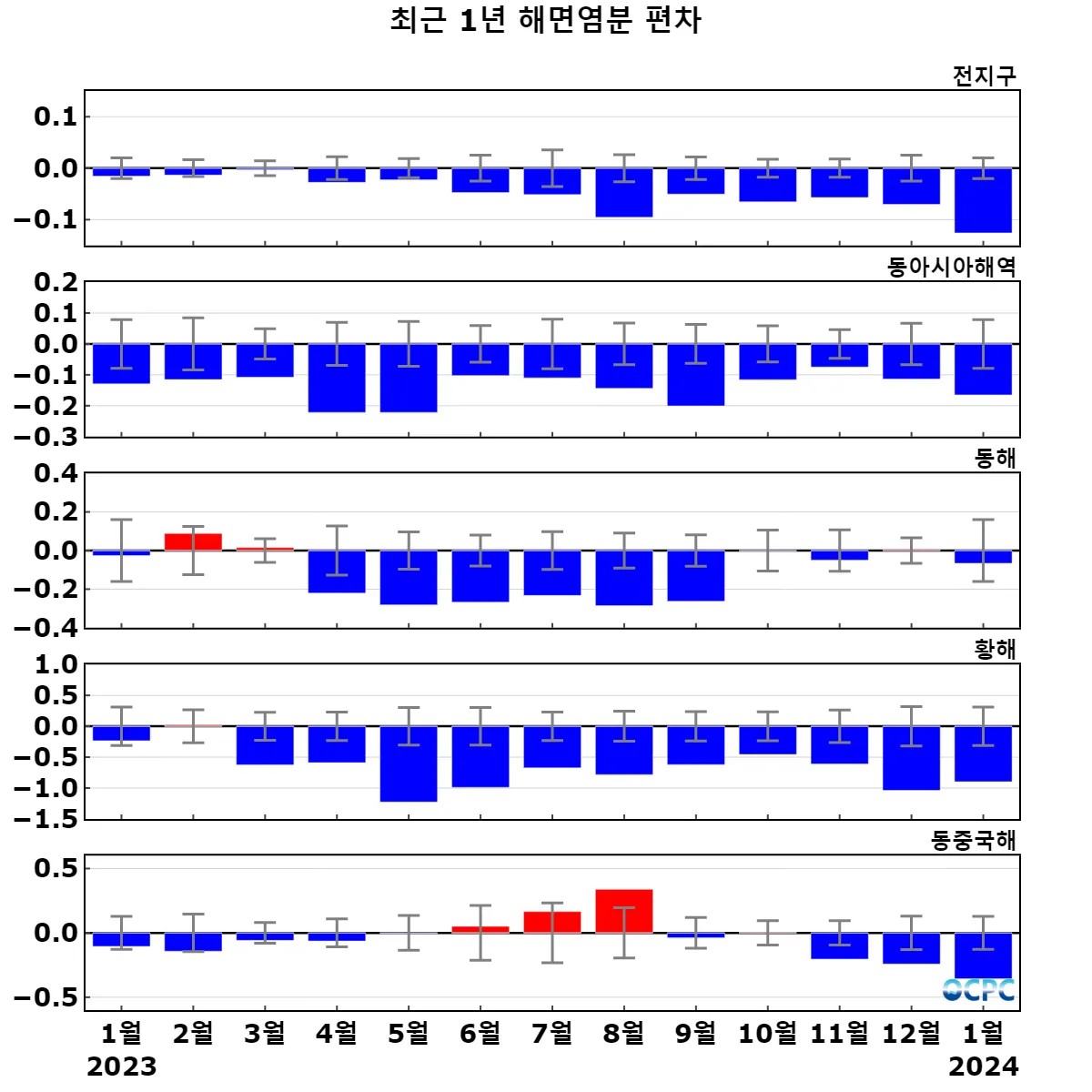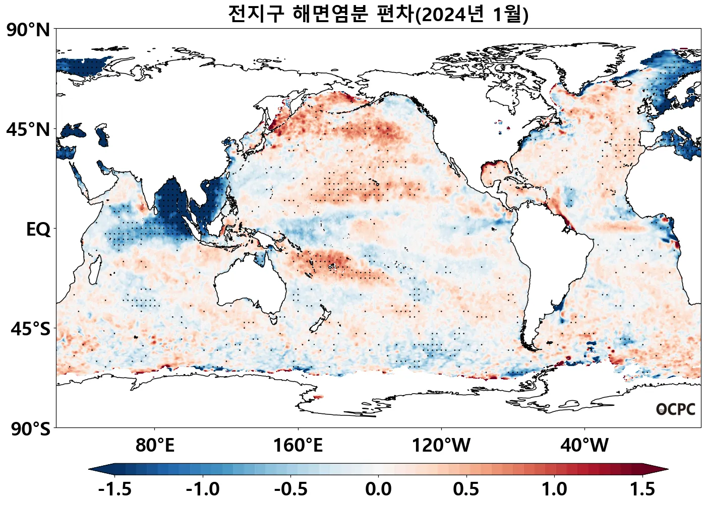 인공위성(SMAP)을 이용한 해면염분 추정 자료는 2015년 4월부터 활용가능하나 기간이 짧고 다른 자료에 비해서 불확실성이 큽니다. 2024년부터는 9년 정도의 자료가 확보되는 시점이어서 기간 평균 대비 월별 편차를 시범적으로 제공하오니 참고하시기 바랍니다.