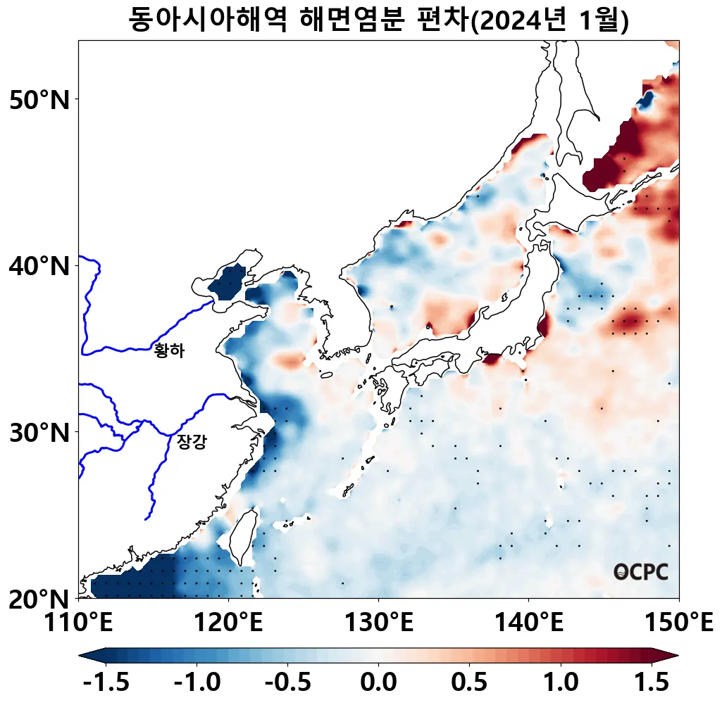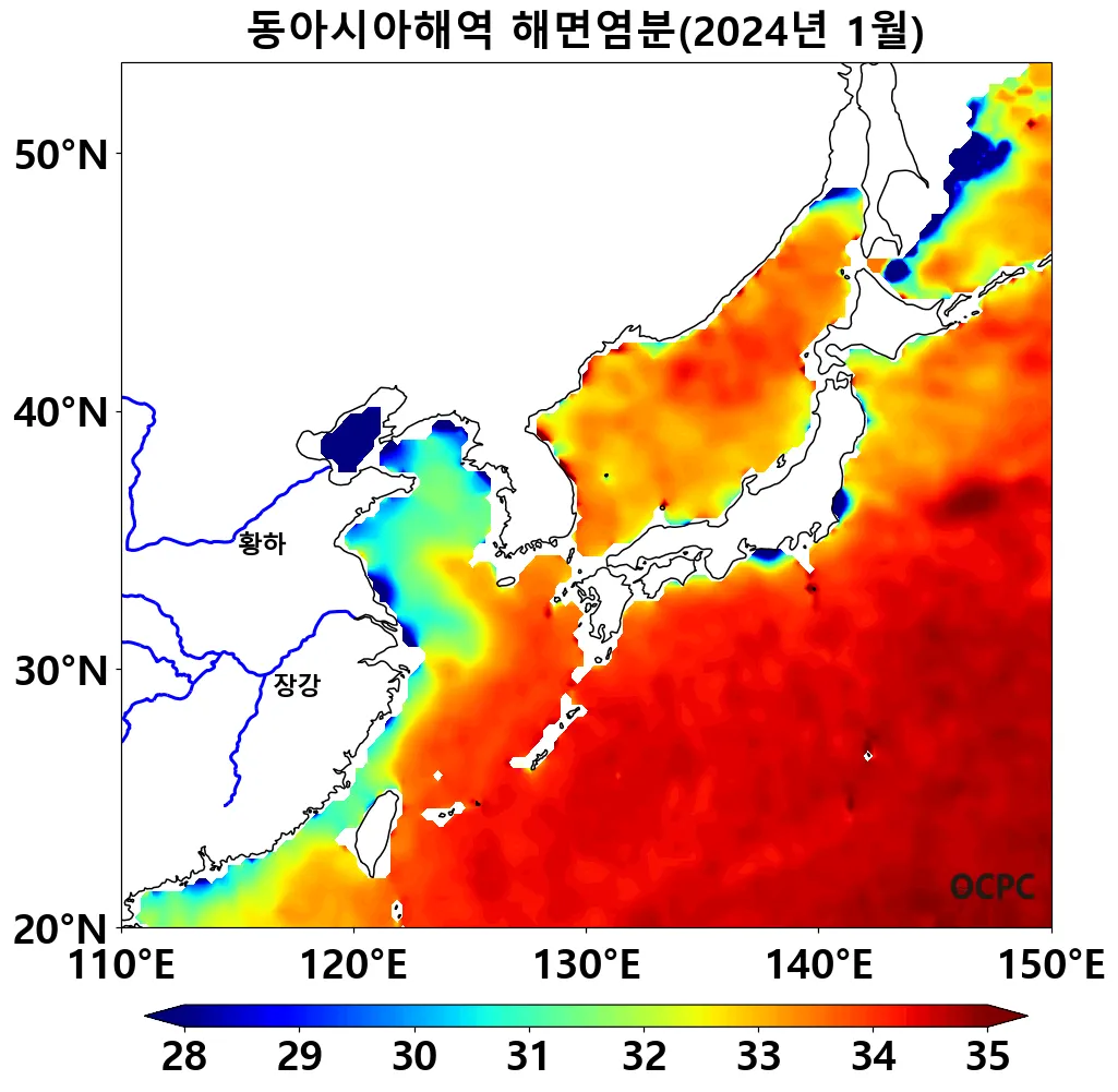 저염분인 중국 연안류가 북서풍에 의해 남하하고 장강 하구역의 남서풍 편차에 의해 장강 하구역의 해면염분은 자료기간 평균보다 낮게 분포하는 양상을 띠고 있습니다.