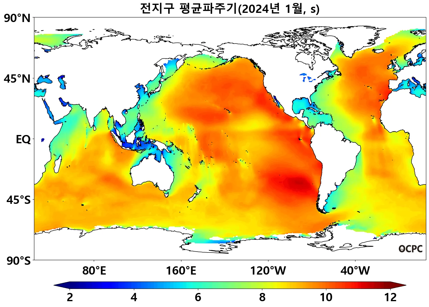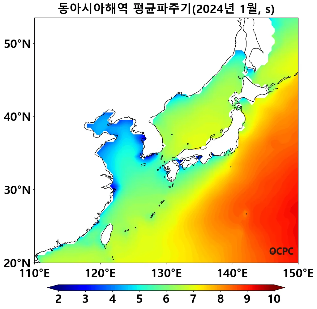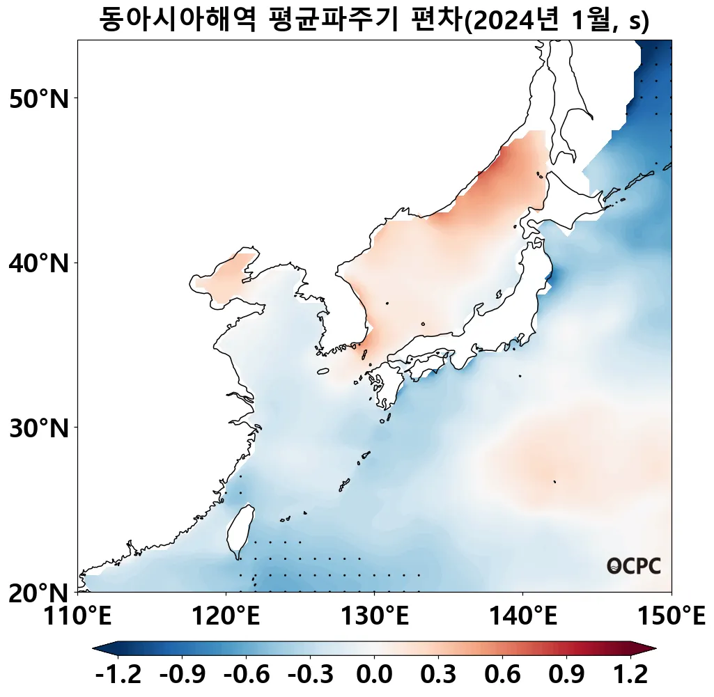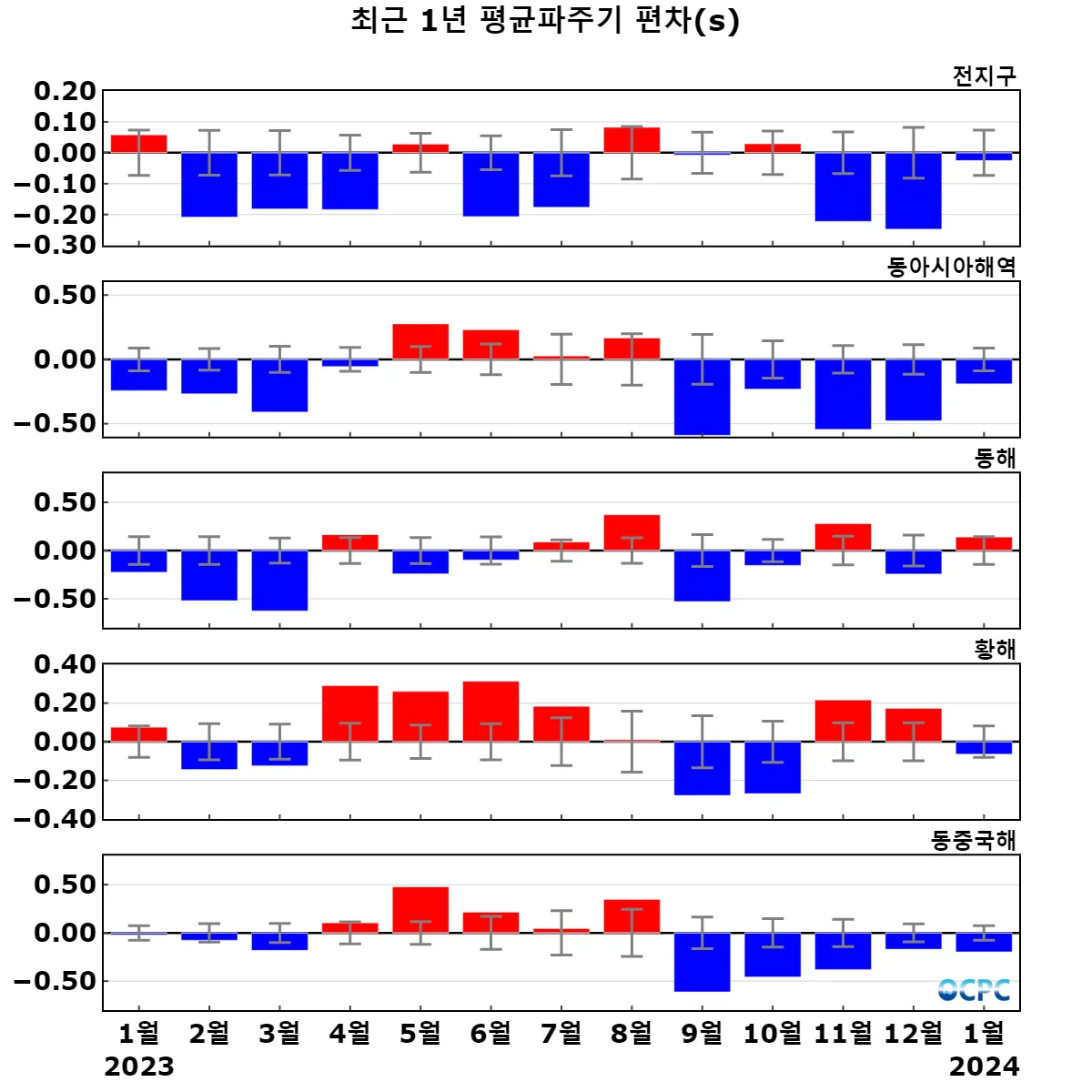 동중국해는 평년(5.97±0.08초)보다 0.20초 감소했으며, 동해, 황해는 평년(6.25±0.14초, 4.64±0.08초)과 비슷했습니다.