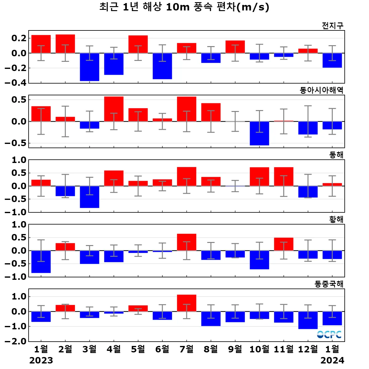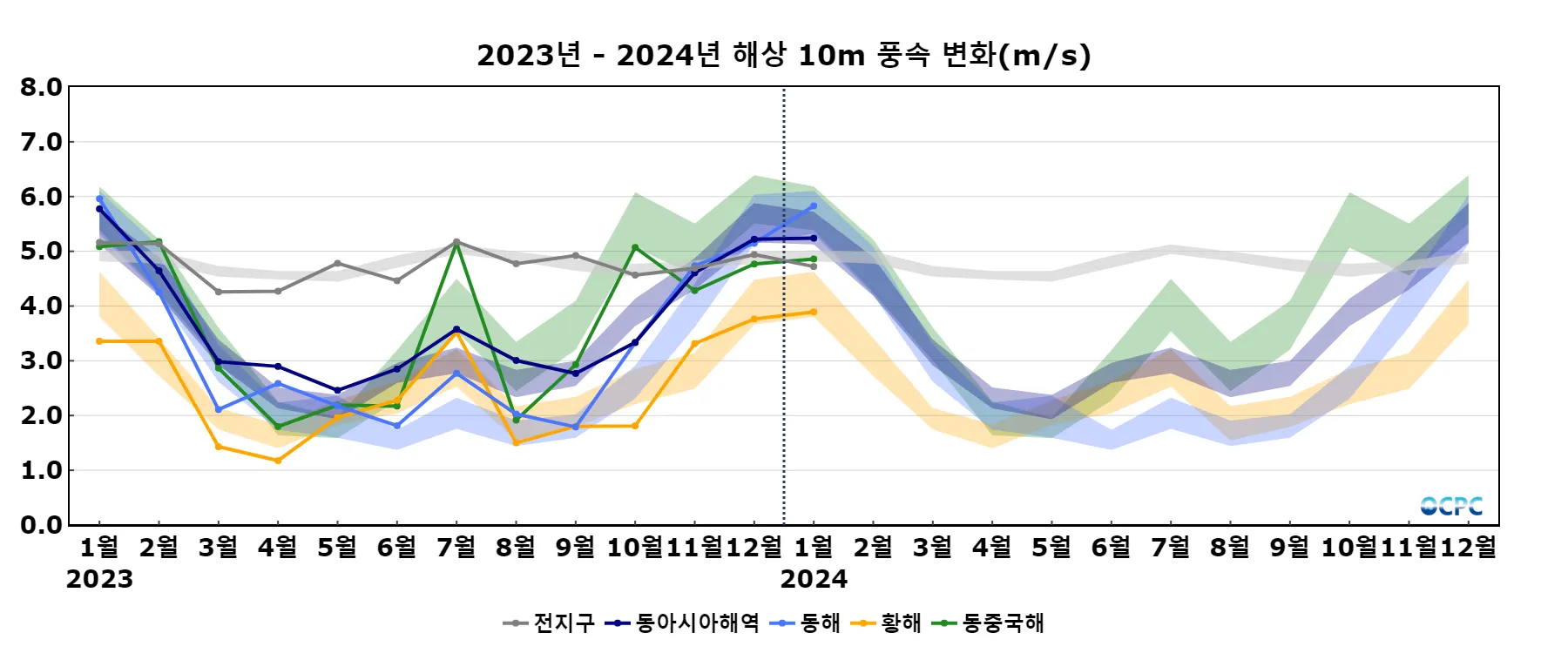 동해, 황해의 해상풍속은 평년(5.7±0.4m/s, 4.2±0.4m/s)과 비슷했고, 동중국해의 해상풍속은 평년(5.8±0.4m/s)보다 0.9m/s 낮았습니다.