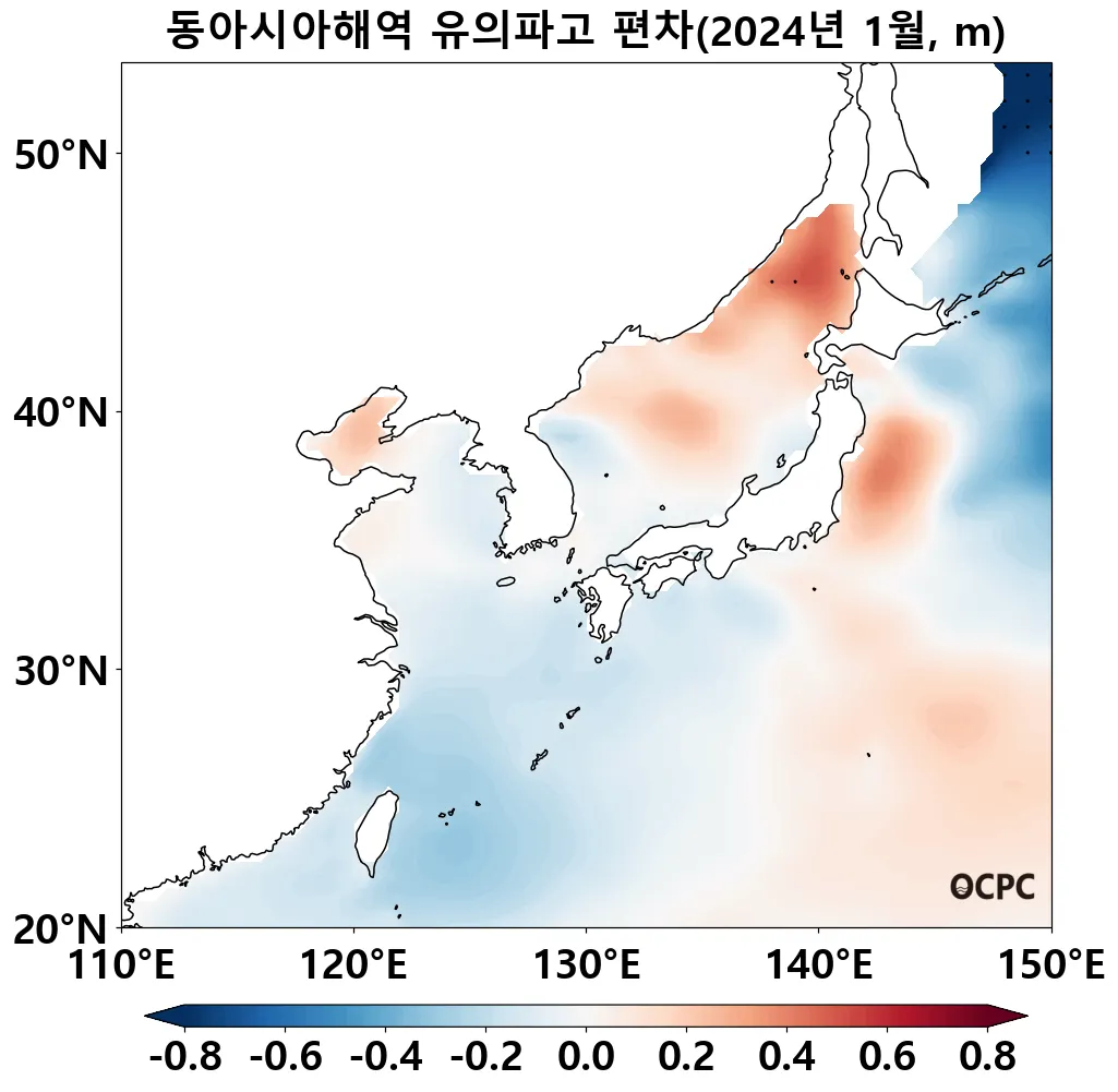 동해는 평년(7.6±0.2°C)보다 1.6°C 높아 1982~2024년(1월) 중 상위 1위를 기록했습니다. 수온 전선이 북상함에 따라 강한 양의 편차가 나타나고 있습니다.