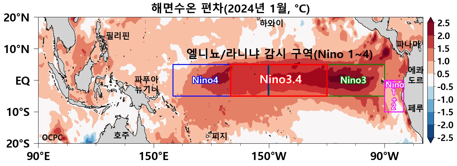 엘니뇨/라니냐 감시구역인 열대 태평양 Nino3.4 해역(5°S~5°N, 170°W~120°W)의 1월 평균 해면수온 편차는 1.8°C로 엘니뇨가 강하게 유지되고 있습니다.