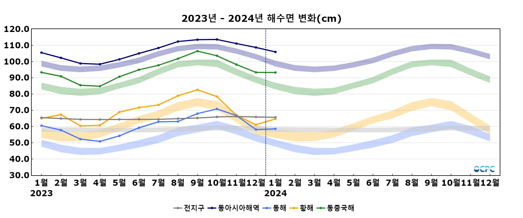 1994~2024년 동안 전지구 평균 1월 해수면은 10년에 3.6cm씩 상승하는 추세입니다. 동아시아해역은 10년에 3.6~4.3cm씩 상승하는 추세이며, 그 중 황해의 상승률이 가장 높습니다.
