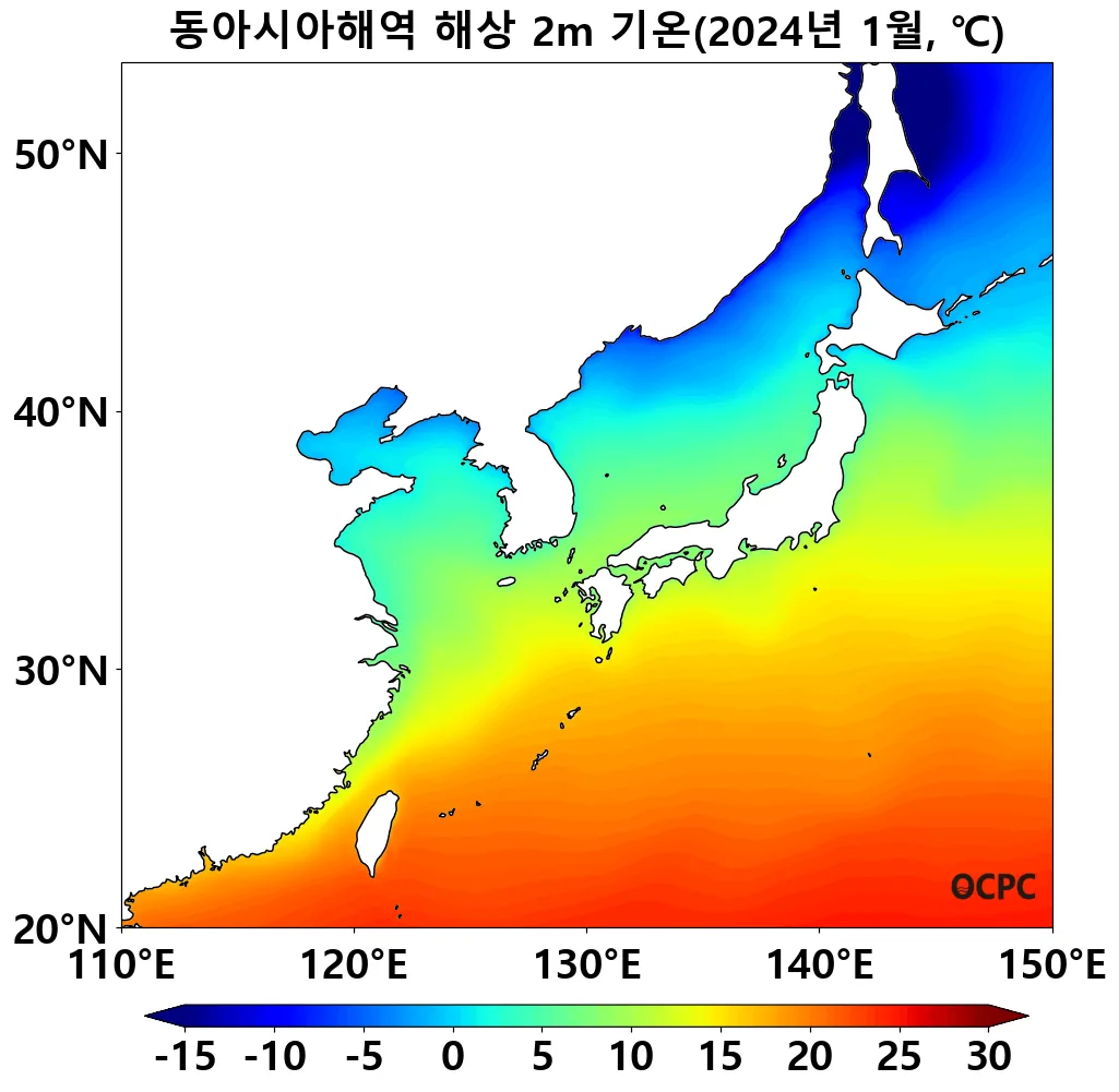 1994~2024년 동안 전지구 1월 해상기온은 10년에 0.2°C씩 증가하는 추세입니다. 동아시아해역은 10년에 0.2~0.3℃씩 증가하는 추세이며, 그 중 동해의 상승률이 가장 높습니다.