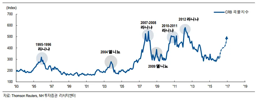 2015년에도 여름내내 (5월부터 9월까지) 폭염과 열대야 현상이 빈발하였고 댐의 저수율이 30%까지 떨어졌었는데 이 시기 역시 강력한 엘니뇨와 때를 같이 합니다. 수퍼엘니뇨가 오면 서태평양 연안 (동북아, 동남아, 호주 등)연안이 매우 건조해져서 쌀, 설탕, 니켈, 보리 등이, 수퍼라니냐때에는 동태평양 연안의 가뭄으로 인하여 밀, 콩, 옥수수 등이 타격을 받습니다. https://www.cmegroup.com/ko/education/featured-reports/a-look-back-at-the-el-nino-of-2015-16.html#