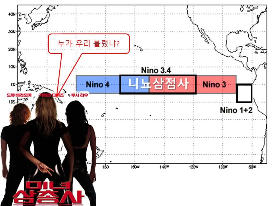 비록 미리 알기는 어렵다해도 지금 현재 엘니뇨/라니냐가 진행중인가 알려주는 지표는 있습니다. 열대태평양중에서도 서경120~170와 북위5도~남위5도 구간(이른 바 nino3.4)의 최근3개월간 표층수온과 평년평균과의 차이가 5개월 연속하여 섭씨0.5도 이상 나면 엘니뇨·라니냐가 온 것으로 간주됩니다.