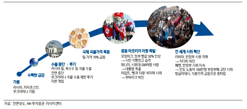 1990이후 30년동안 있었던 국제곡물가격 폭등사태(1995, 2007, 2010, 2012...)는 모두 수퍼라니냐와 괘를 같이 하는데 그중에서도 가장 강력했던 2010/2011라니냐는 국제밀가격을 폭등시켰고 (애그플레이션) 러시아/우크라이나로부터 수입한 밀에 의존하는 중동의 빵값이 일제히 올랐습니다. 생활고로 인하여 증가한 노점상중 한 명이 철거에 항의하며 분신, 중동과 북아프리카를 휩쓴 이른 바 자스민혁명의 신호탄이 되어 튀니지, 이집트, 리비아 등의 독재자들이 줄줄이 몰락하는 나비효과를 냇습니다.