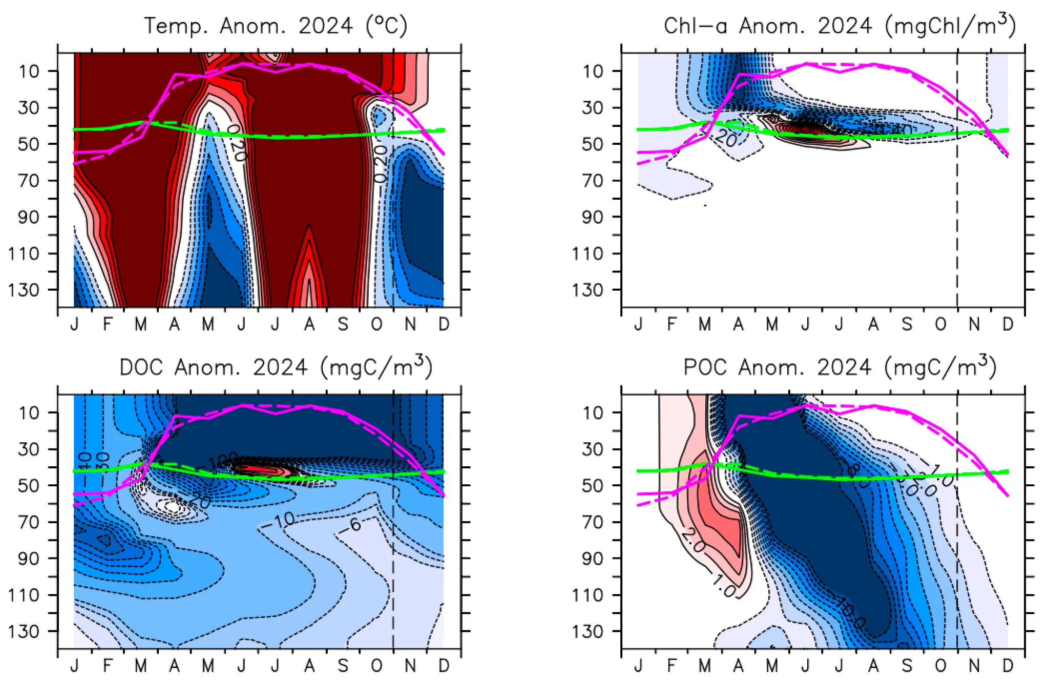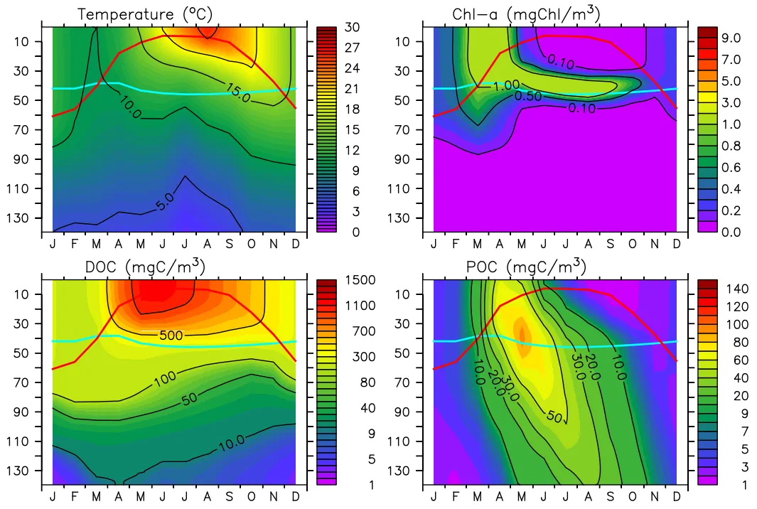 수온, 엽록소(Chl-a), 용존유기물(DOC), 고형유기물(POC)의 10년(2009~2018) 평균 분포(가로축: 월, 세로축: 수심(m)); (붉은선: 혼합층 깊이, 하늘선: 유광층 깊이)