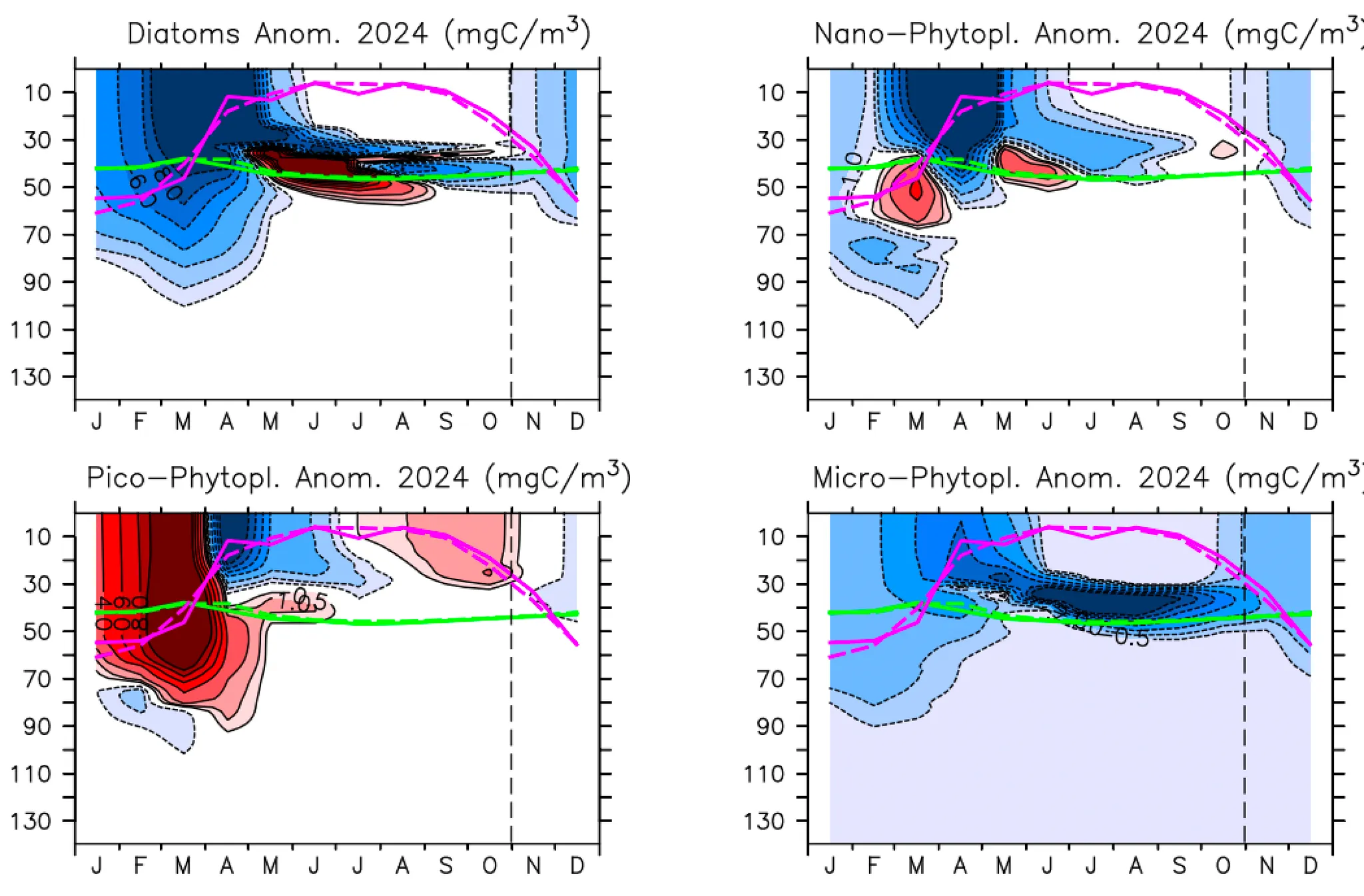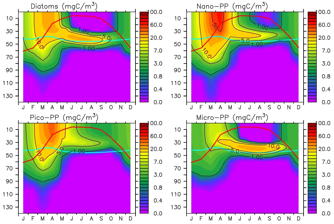 식물플랑크톤(규조류(Diatoms), 미소(Nano-), 초미세(Pico-), 소형(Micro-))의 10년(2009~2018) 평균 분포(가로축: 월, 세로축: 수심(m)); (붉은선: 혼합층 깊이, 하늘선: 유광층 깊이)