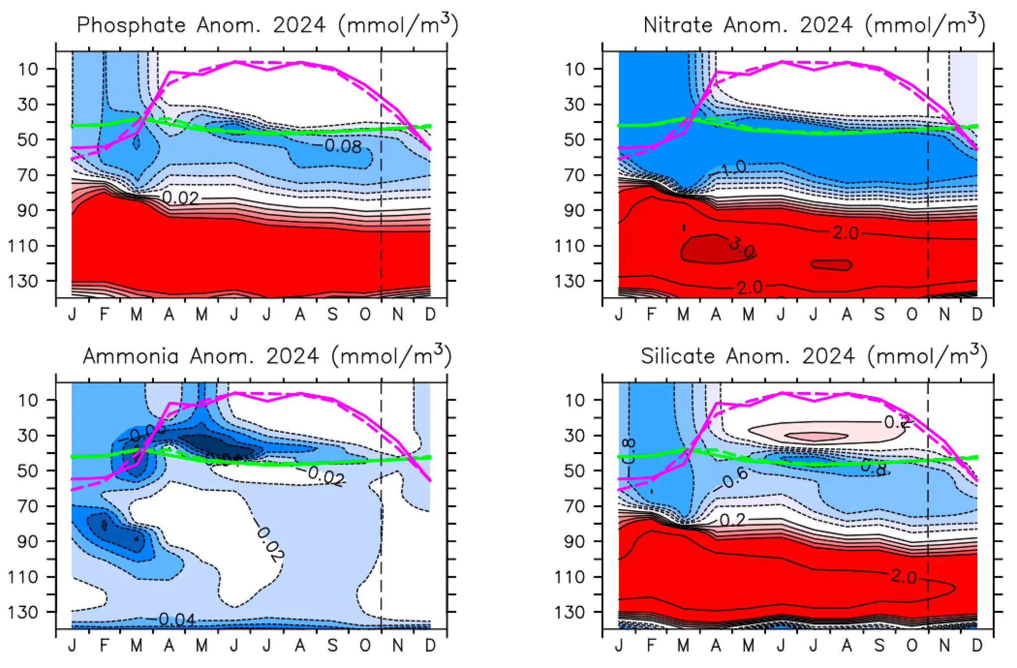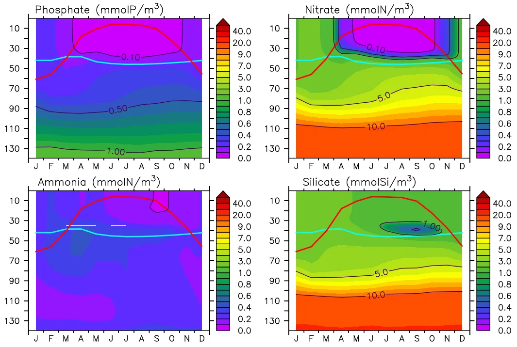 영양염(인산염, 질산염, 암모니아, 규산염)의 10년(2009~2018) 평균 분포(가로축: 월, 세로축: 수심(m)); (붉은선: 혼합층 깊이, 하늘선: 유광층 깊이)