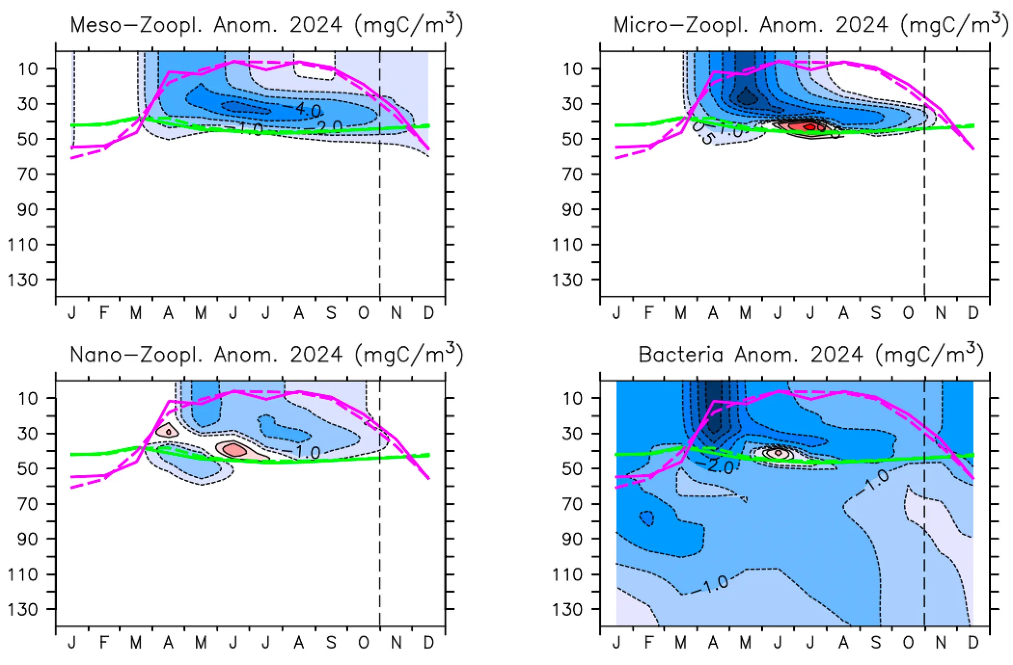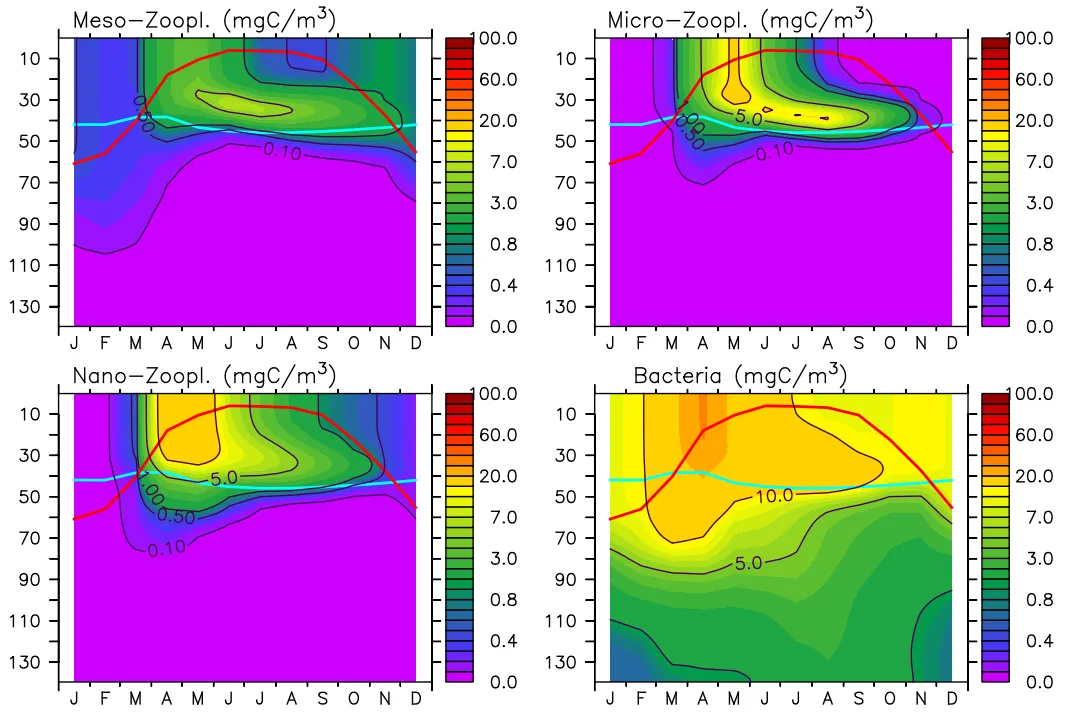 동물플랑크톤(중형(Meso-), 소형(Micro-), 미소(Nano-), 박테리아)의 10년(2009~2018) 평균 분포(가로축: 월, 세로축: 수심(m)); (붉은선: 혼합층 깊이, 하늘선: 유광층 깊이)