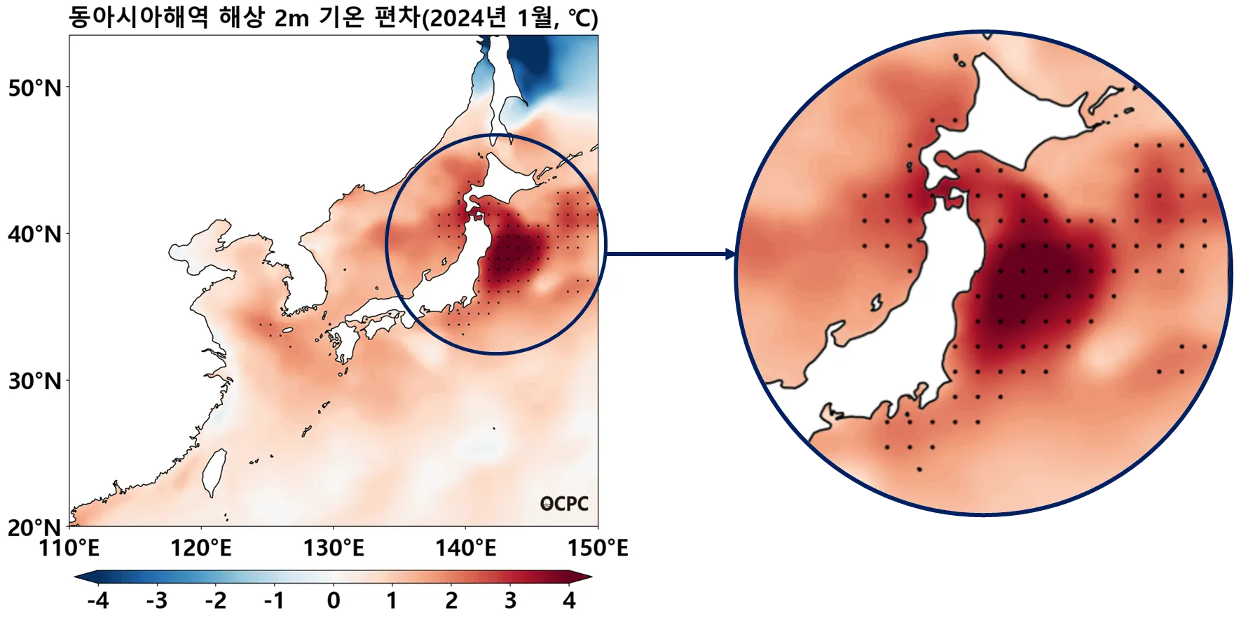 해양열파: 해양열파란 수일 혹은 그 이상 지속되는 해수 온도의 극단 현상으로 열파가 오래 지속될 경우 생태계 및 어업, 해양레저 산업 등에 심각한 영향을 줄 수 있습니다. 평년기간의 일 해면수온 관측값의 90백분위 수에서 일 평년값을 뺀 후 5일 이동평균한 값을 해양열파의 임곗값으로 산정합니다. 관측 해면수온 편차값이 해양열파 임곗값을 넘는 경우를 해양열파라고 정의하며, 임곗값의 2~4 배를 기준으로 가장 낮은 등급인 보통(moderate)에서부터 강함(strong), 심함(severe), 극심함(extreme)까지 4단계로 구분이 됩니다. 1월 해양열파 보러가기