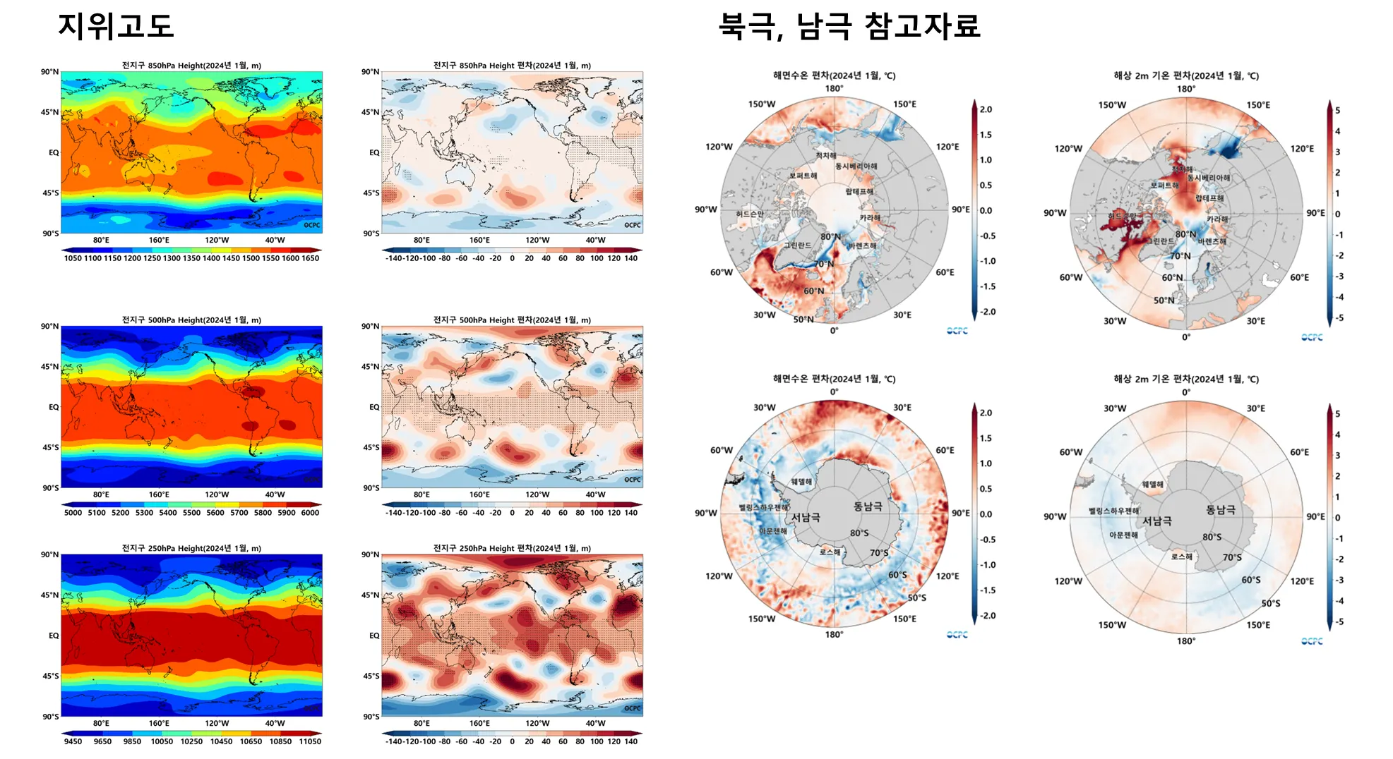 해면기압 및 해상풍 하단의 페이지에서 전지구 지위고도(850hPa, 500hPa, 250ha)를 확인하실 수 있습니다. 1월 지위고도 보러가기