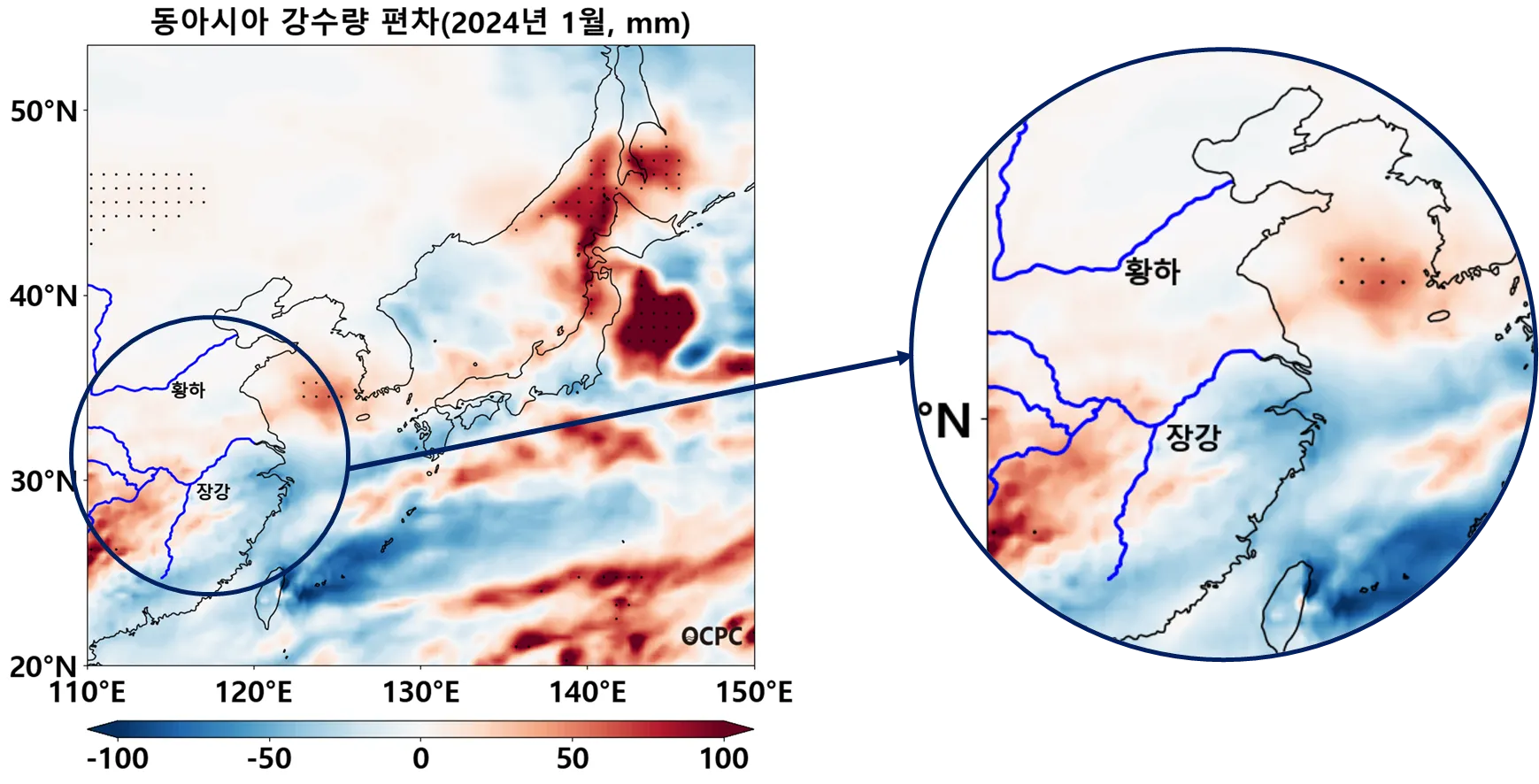 5. 동아시아 해역 강수량, 해면염분에서 황하와 장강의 본류가 표시됩니다.