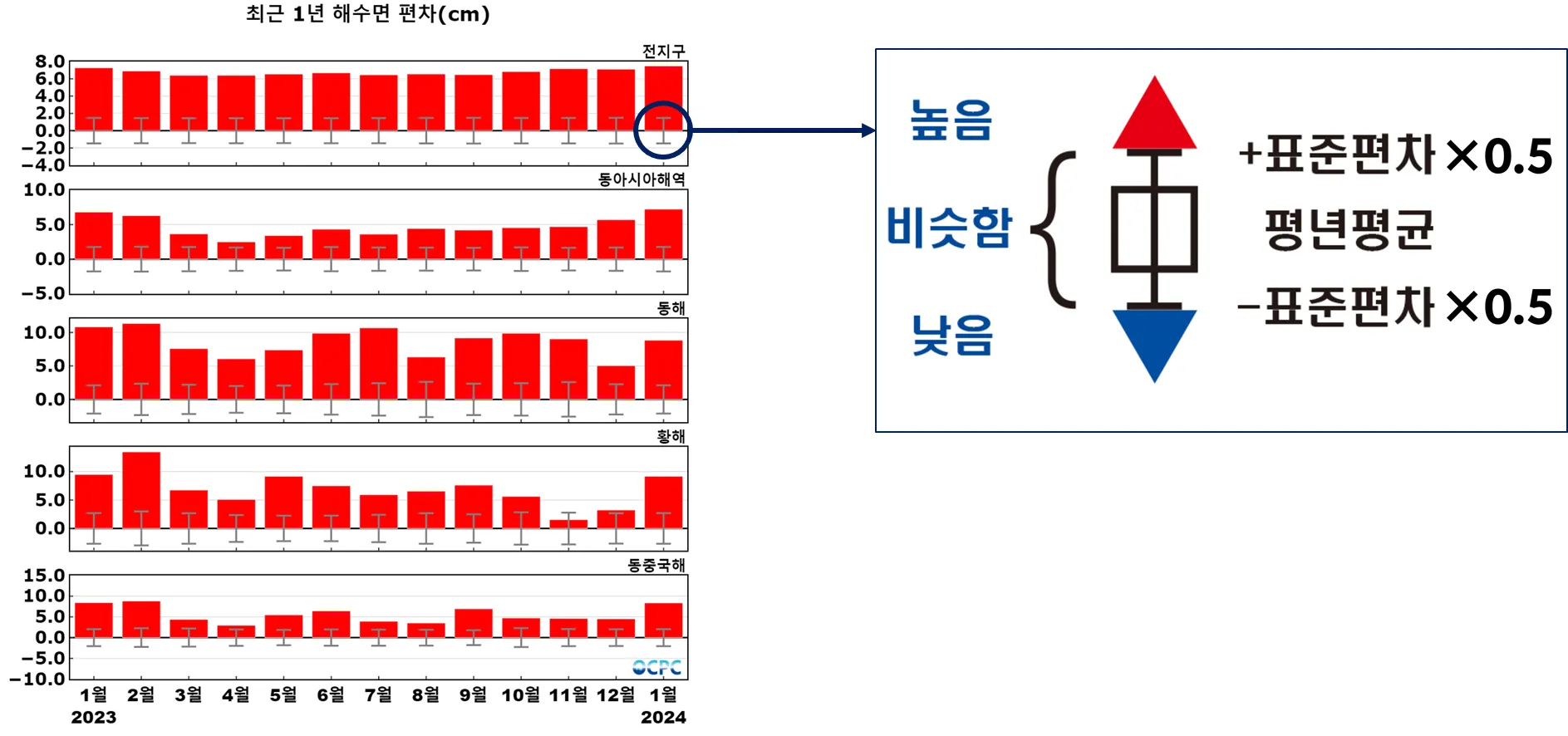 3분위 판정: 해역별 3분위(높음, 비슷함, 낮음) 판정을 위해 설정한 평년 구간이 (평년 평균 ± 표준편차) 에서 (평년 평균 ± 표준편차×0.5)으로 변경되었습니다.