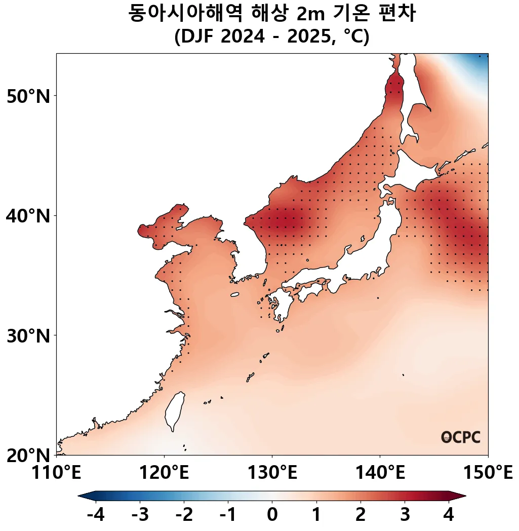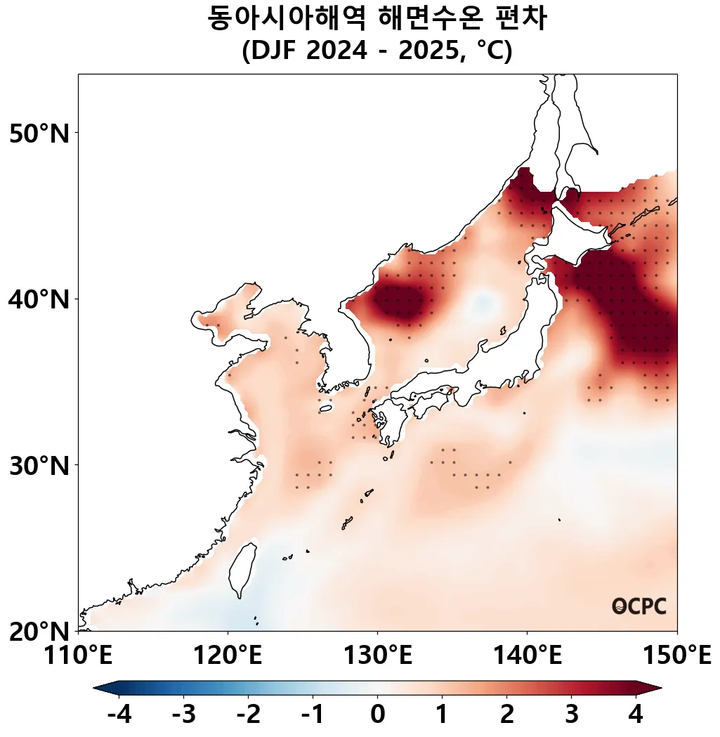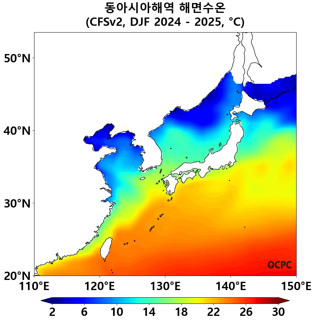 동아시아해역의 2024년 12월~2025년 2월 평균 해상기온은 평년(12.3±0.3℃)보다 높겠습니다.